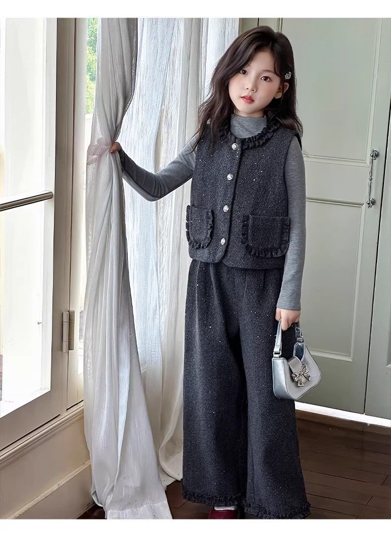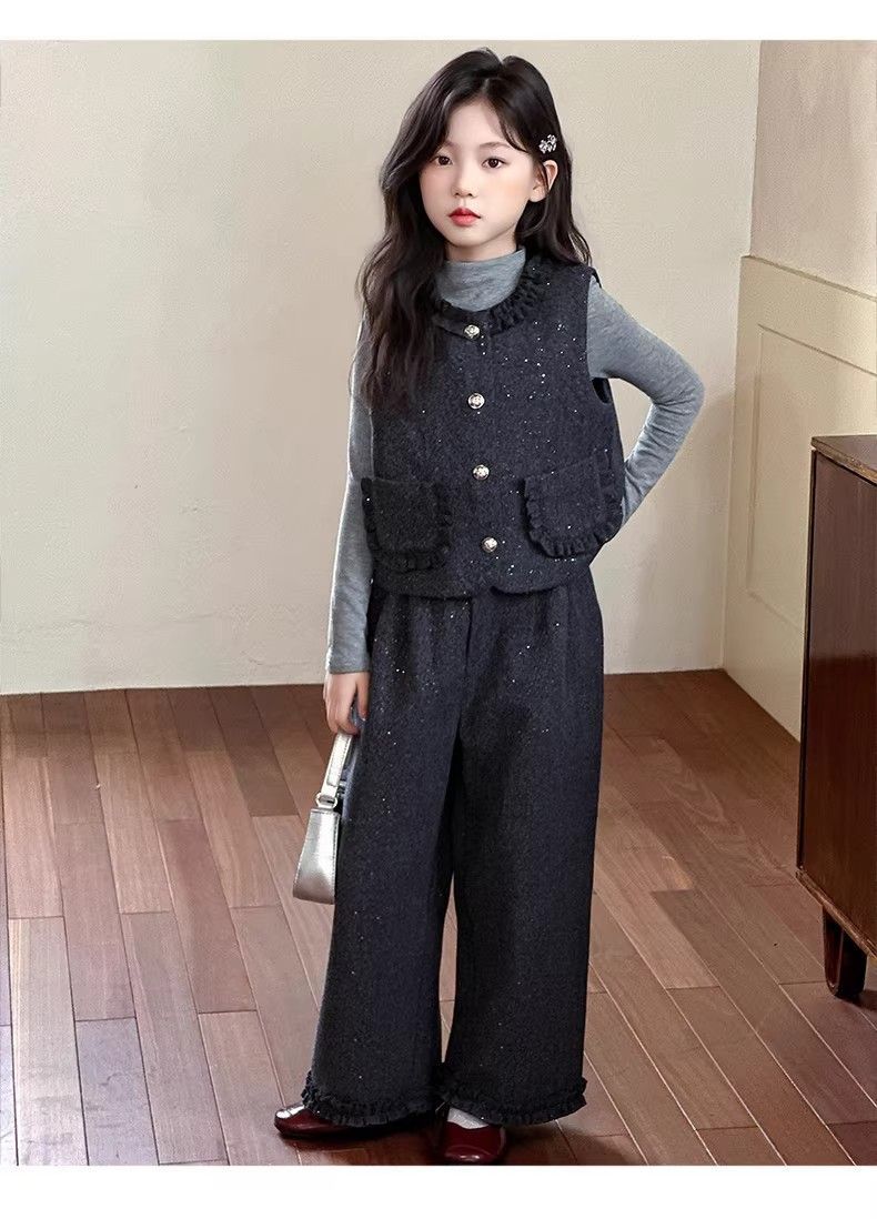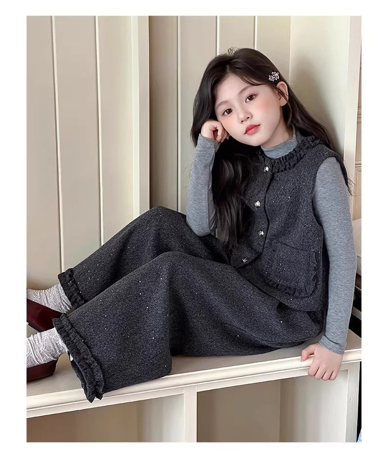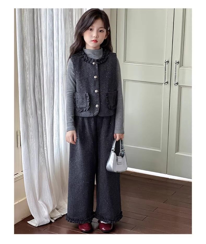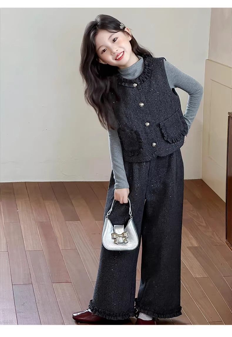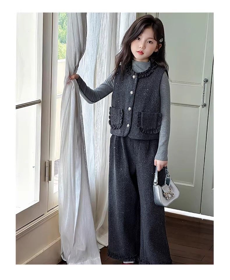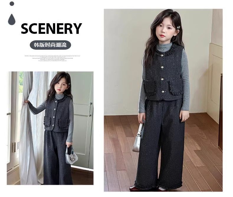 P Girls Spring Xiaoxiangfeng Suit New Fashion Medium and Older Children's Thickened Vest Long Sleeve Wide Leg Pants Two-piece Set