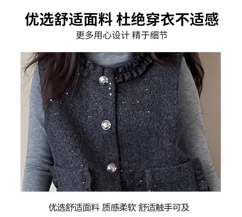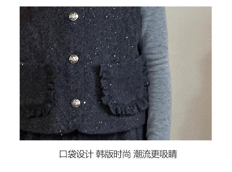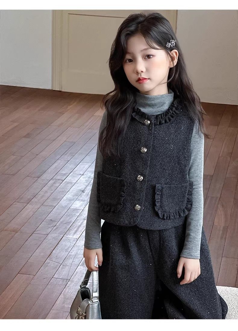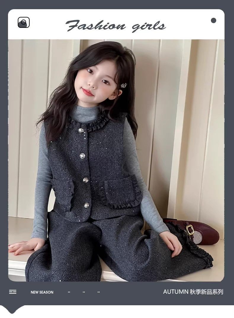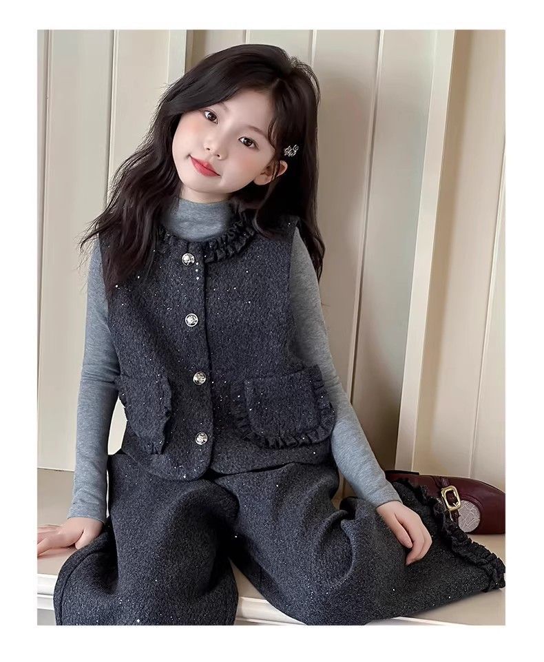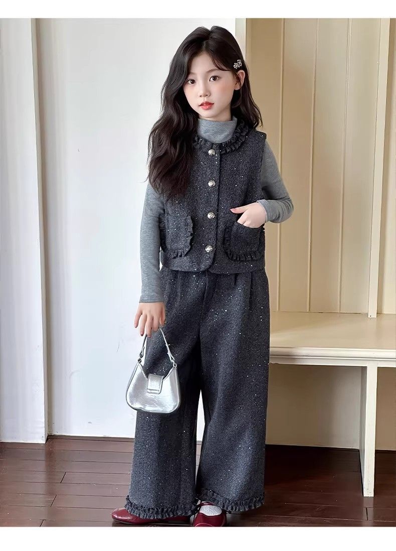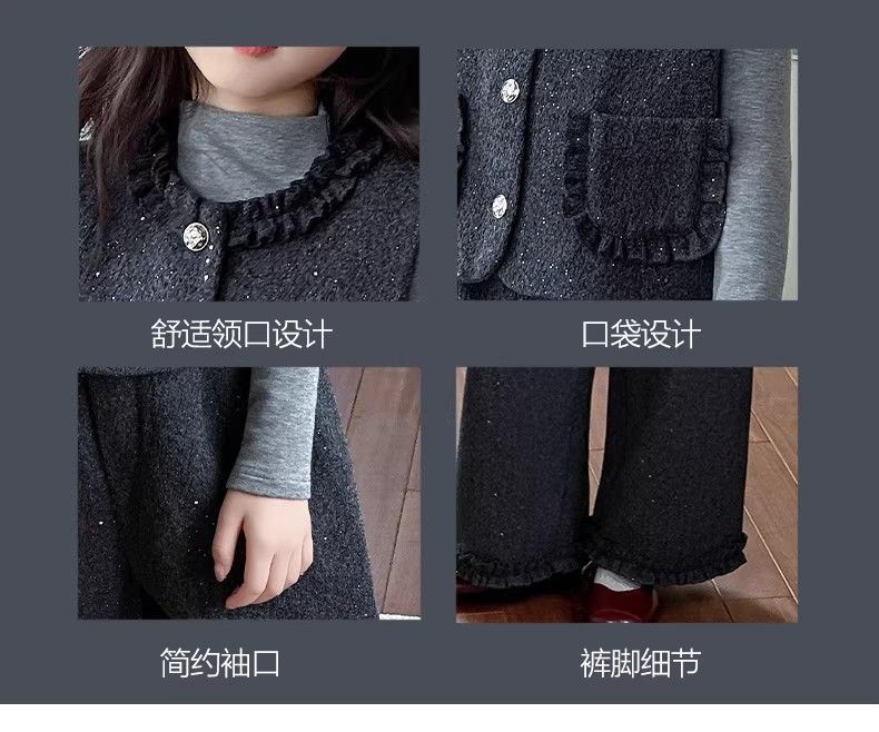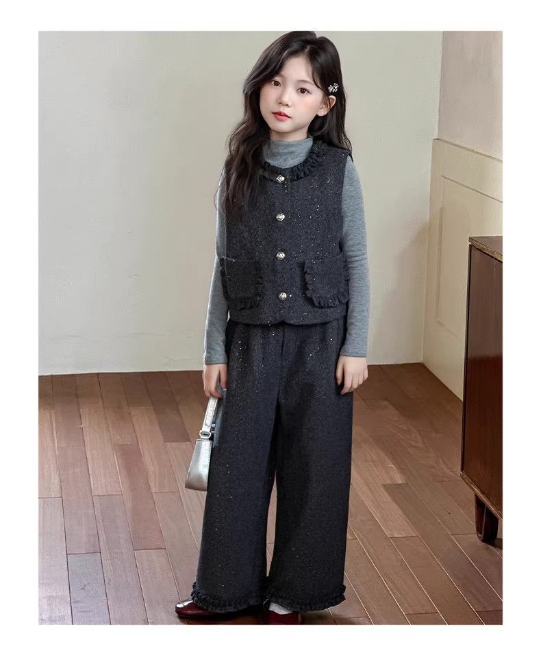 P Girls Spring Xiaoxiangfeng Suit New Fashion Medium and Older Children's Thickened Vest Long Sleeve Wide Leg Pants Two-piece Set