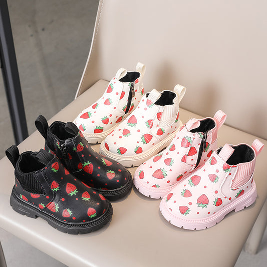 A Boys and Girls Martin Boots Soft-soled Strawberry Versatile Leather Boots