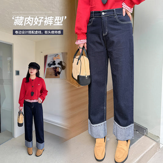A Women's Curled Straight Pants High Waist Jeans