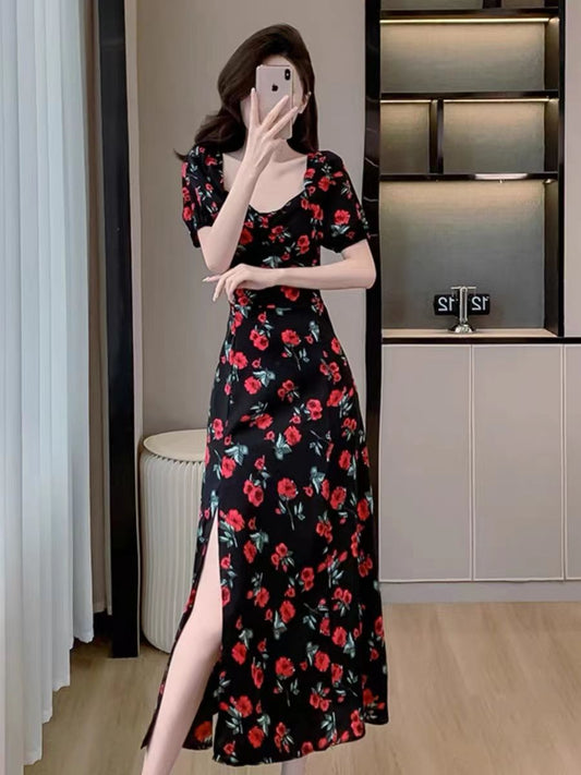 P floral bubble sleeve dress waist long V-neck dress