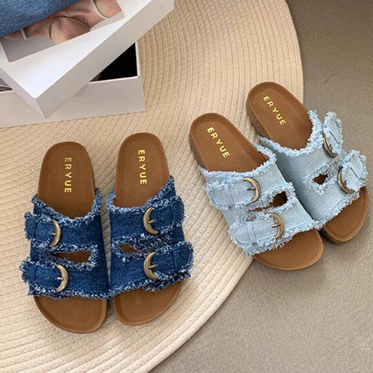 P denim thick-bottomed Birkenstocks slippers women's summer wear new Korean version French temperament casual flat-bottomed women's sandals