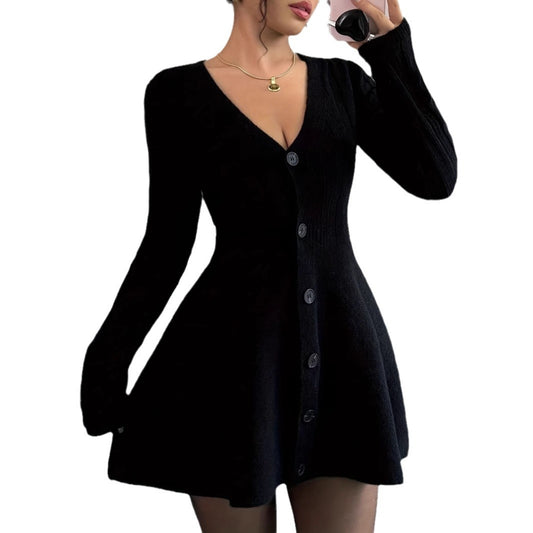 Black V-Neck Long Sleeve Button Knitted Dress Women