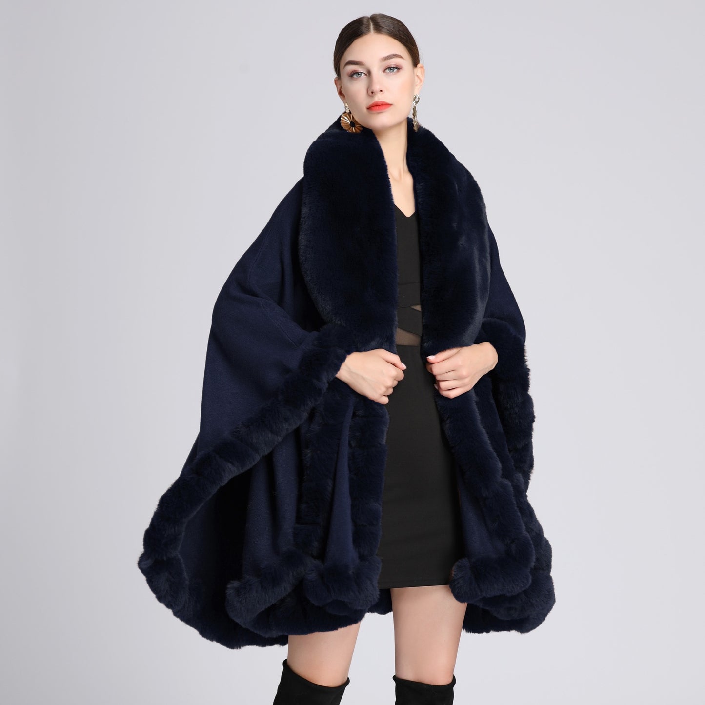A European and American autumn and winter new imitation Rex rabbit fur collar cape large size knitted cardigan loose coat women