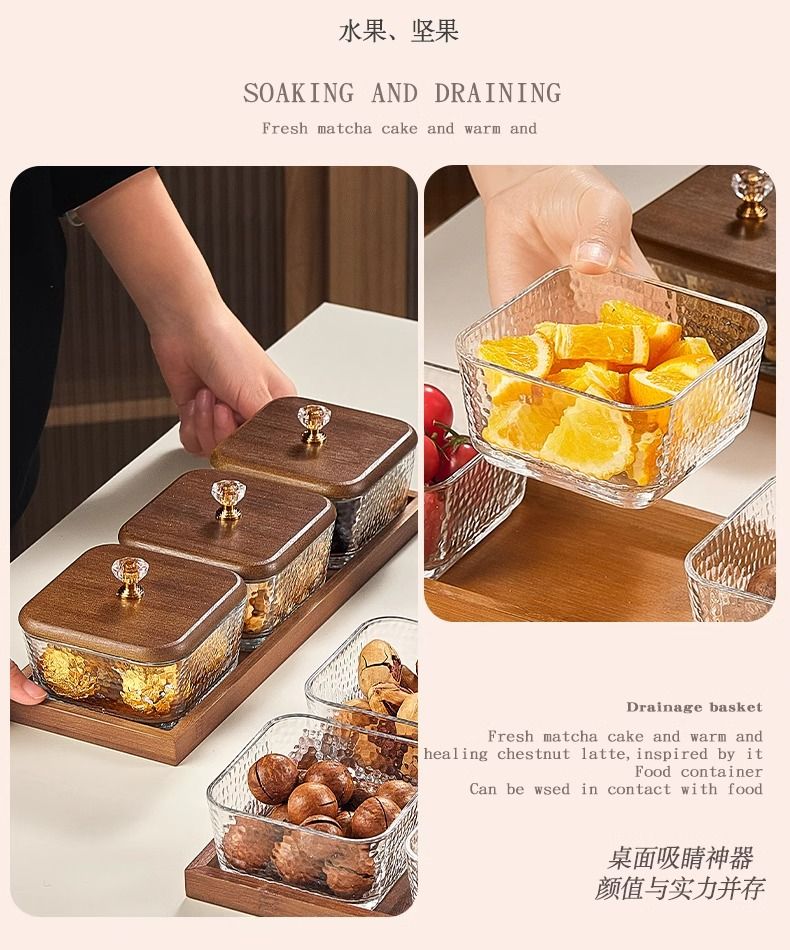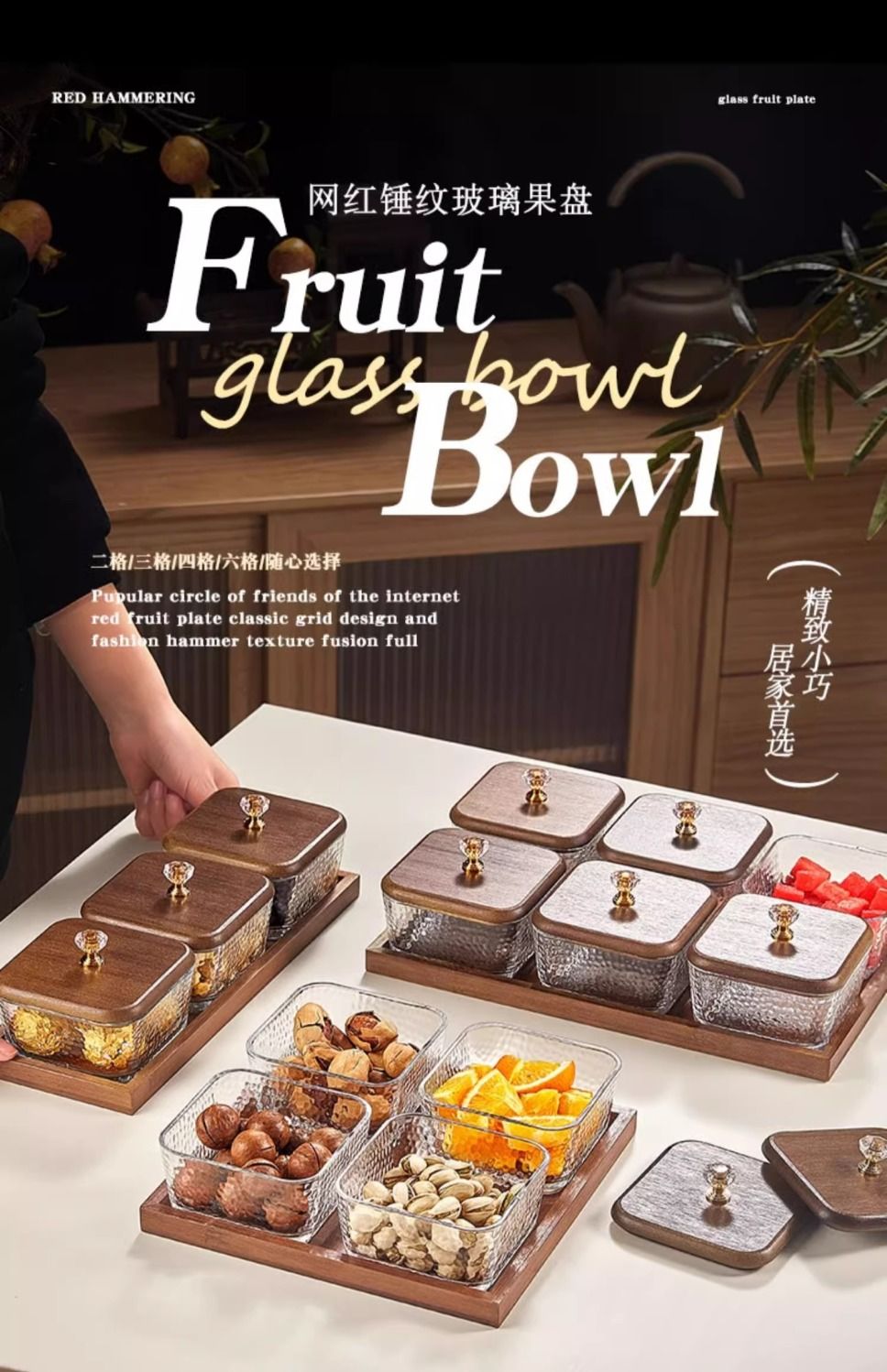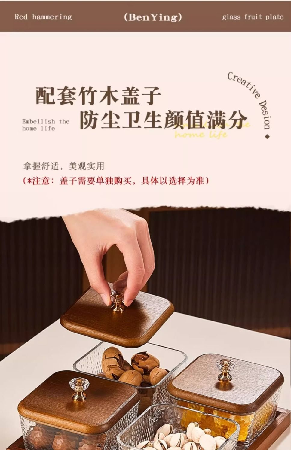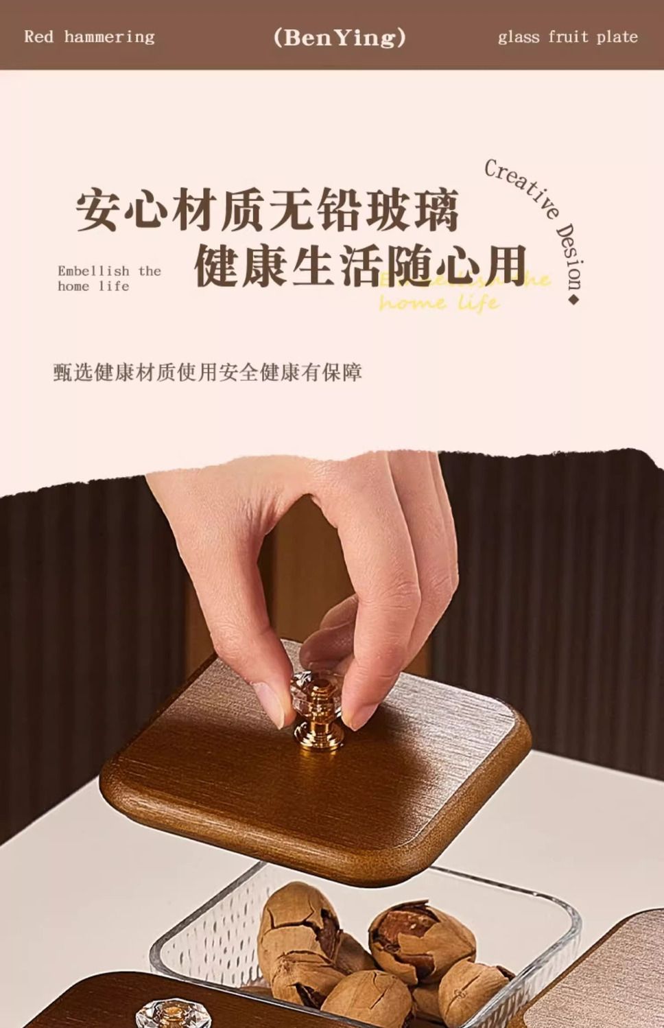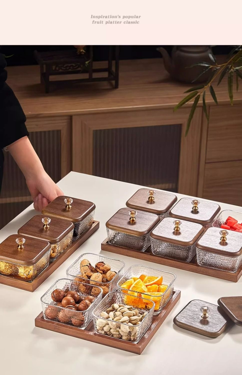 P Bamboo Wood Glass Fruit Snack Plate with Lid