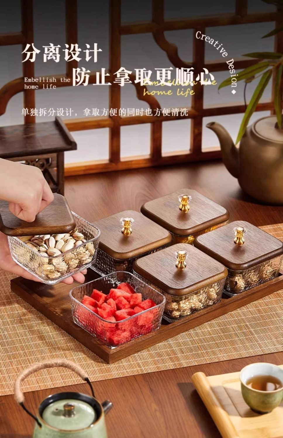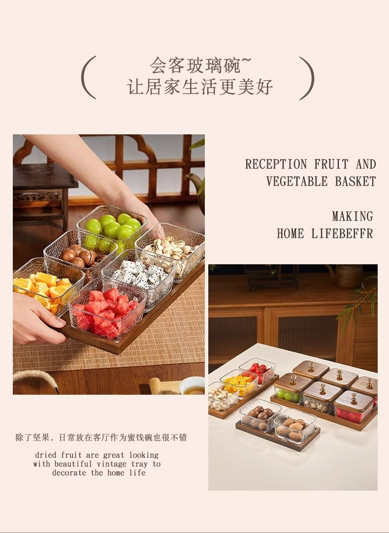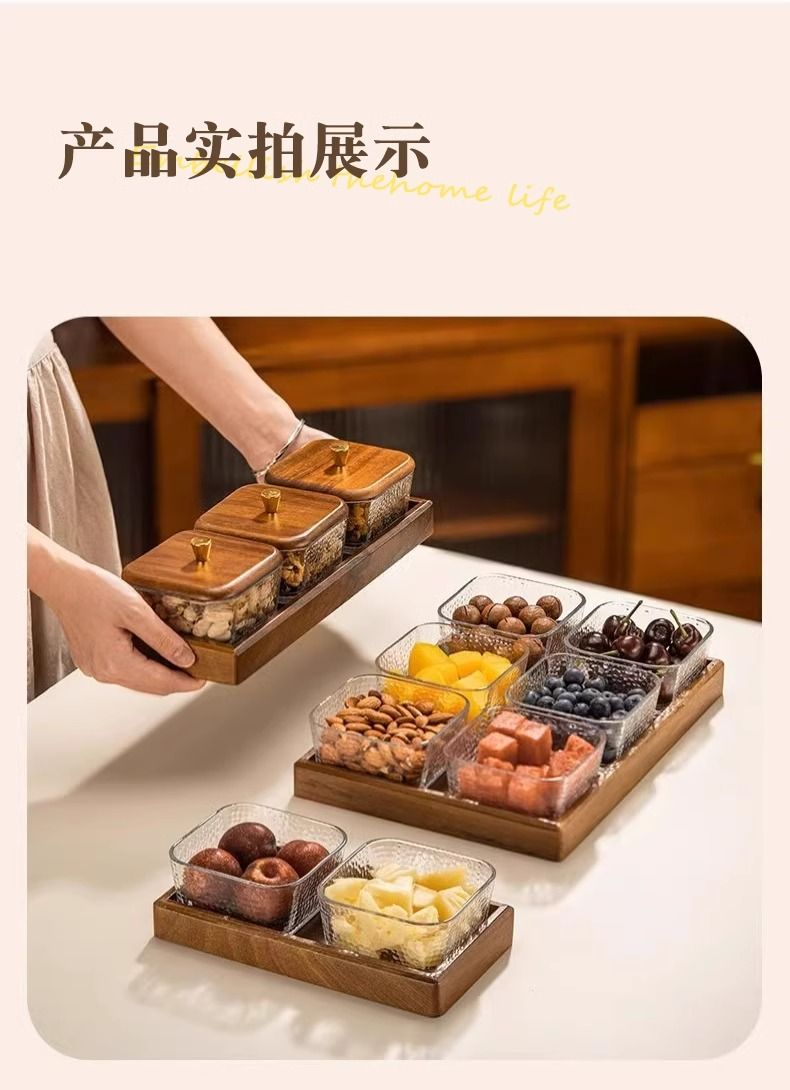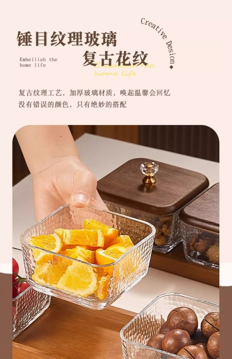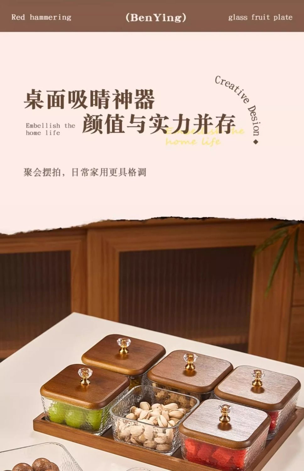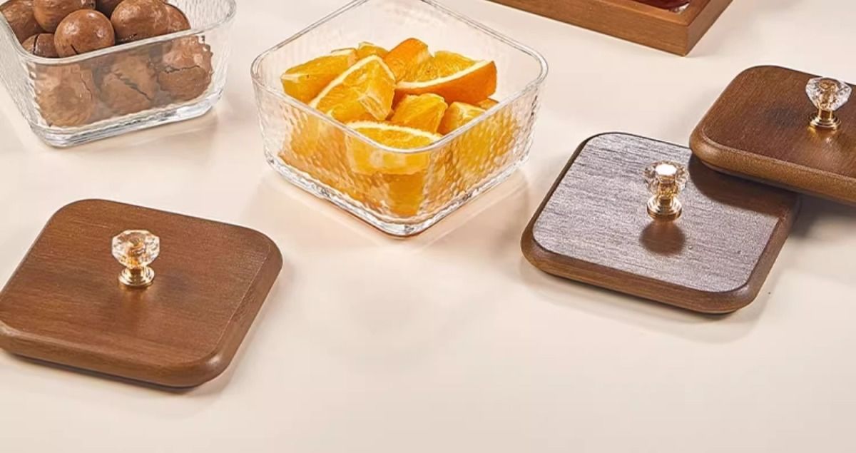 P Bamboo Wood Glass Fruit Snack Plate with Lid