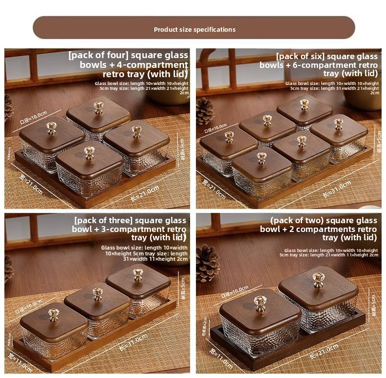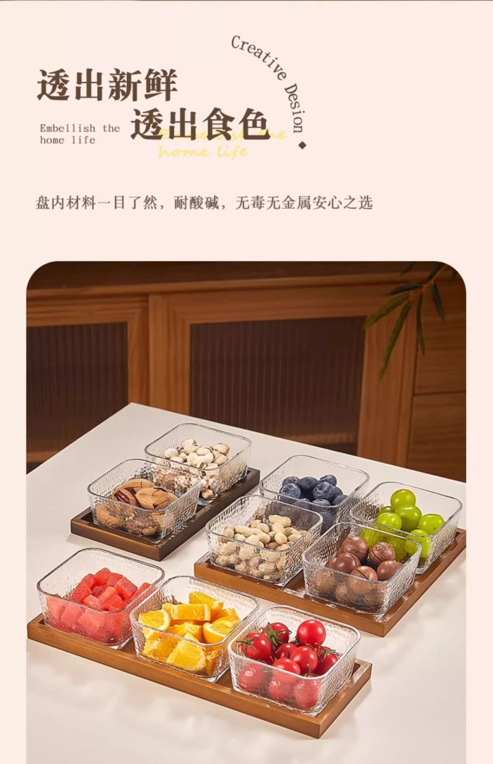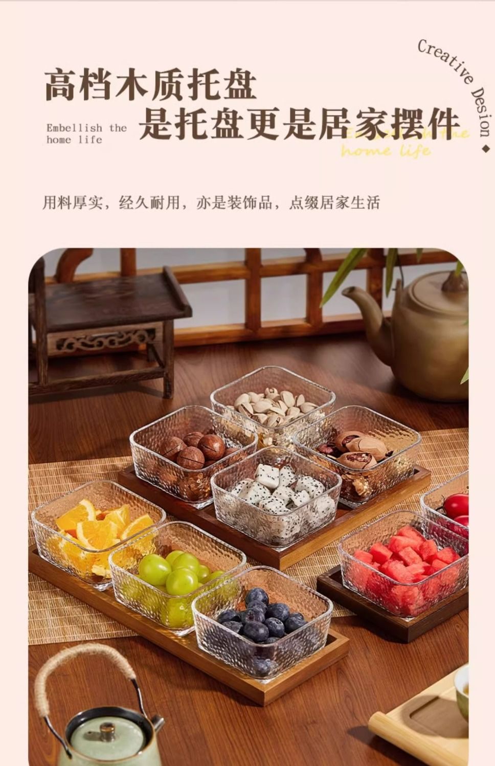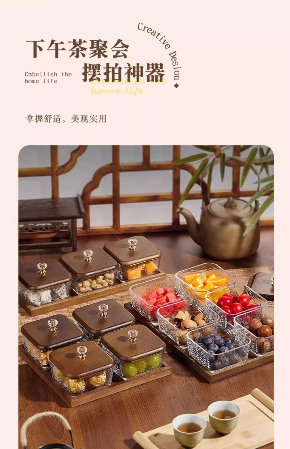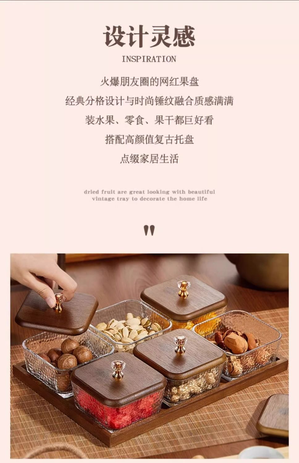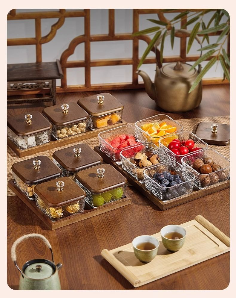 P Bamboo Wood Glass Fruit Snack Plate with Lid