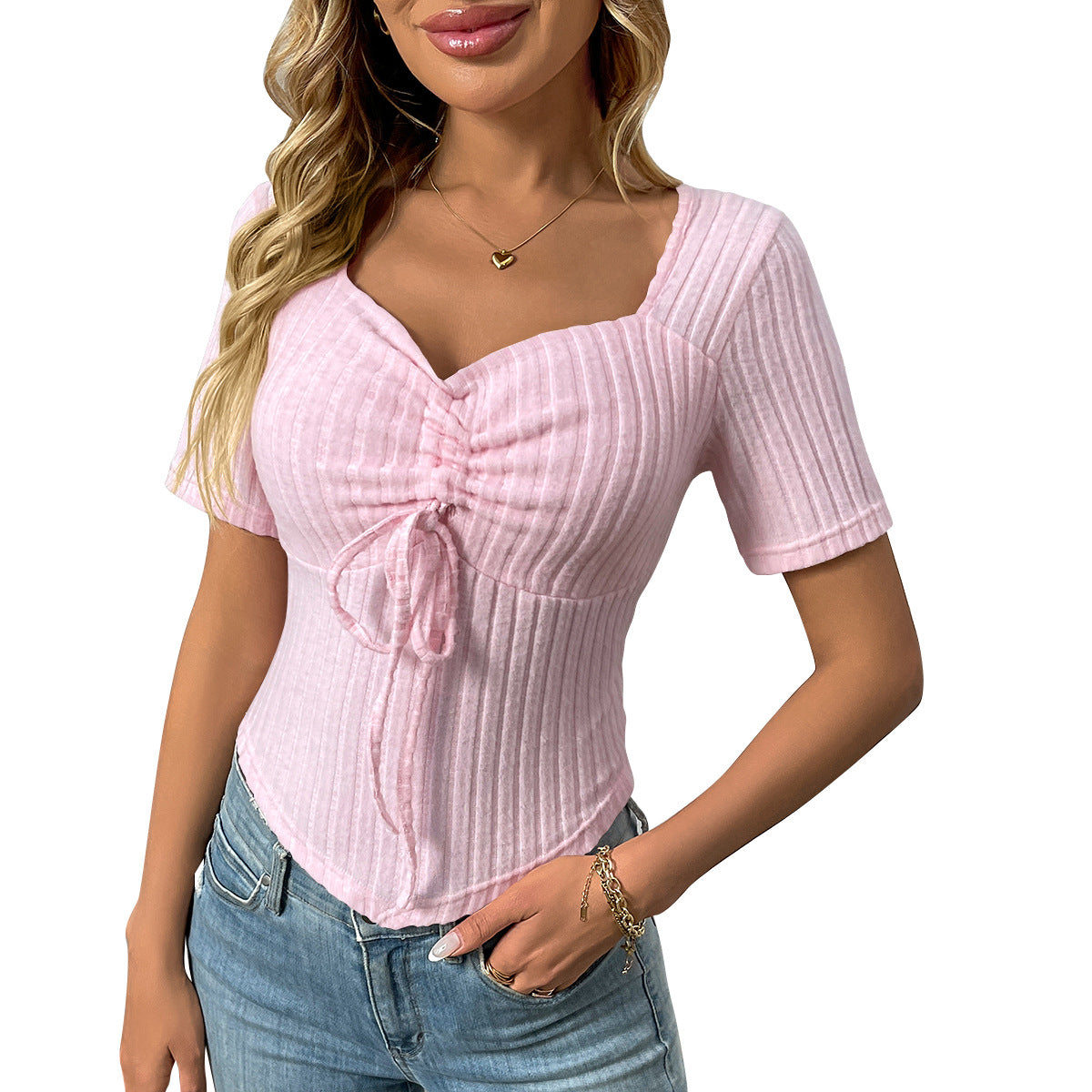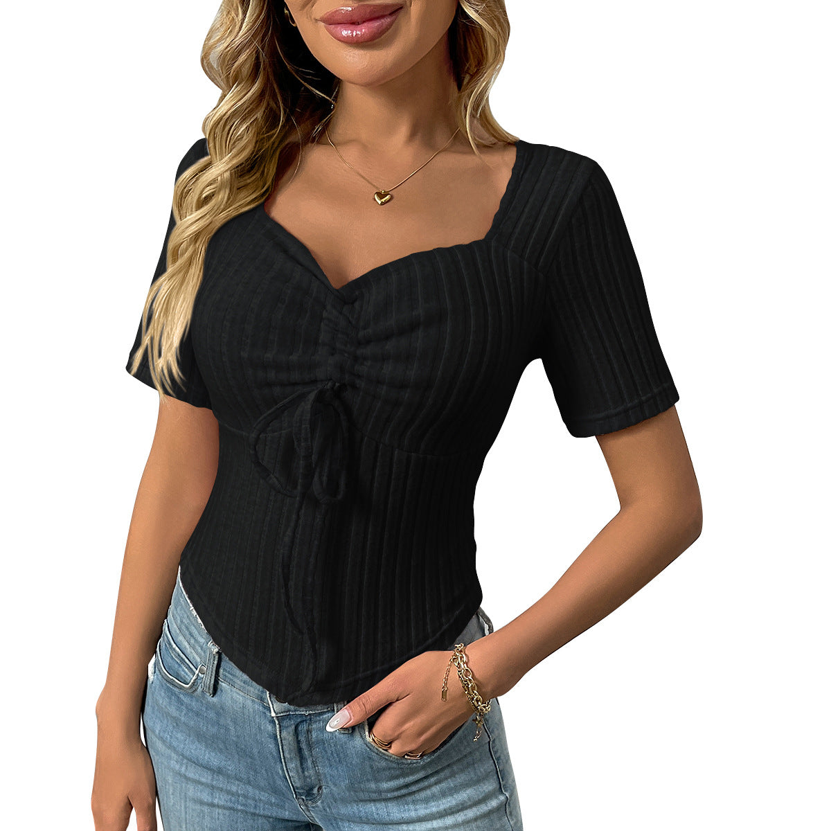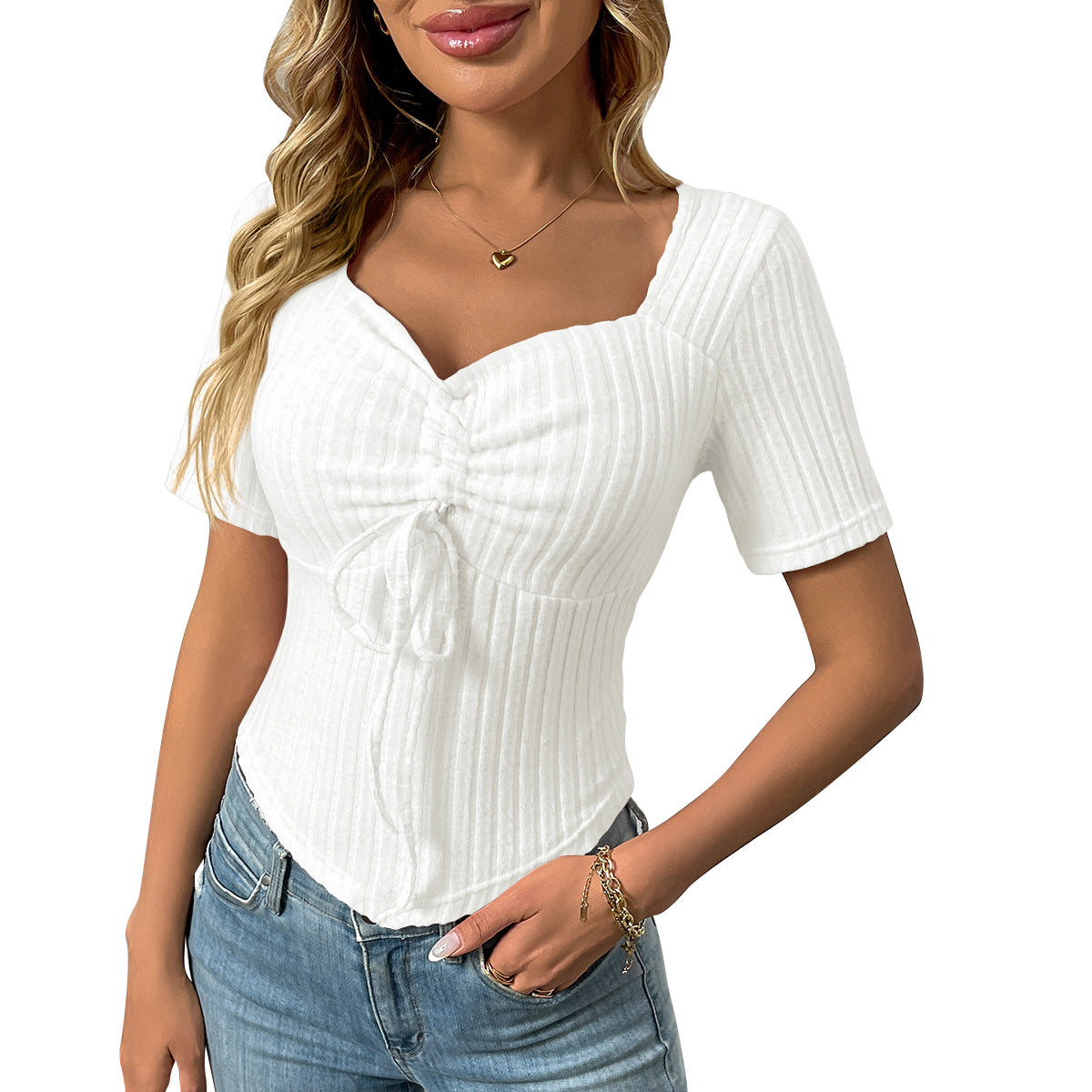 欧美跨境亚马逊独立站2025夏季新款时尚褶皱抽绳性感短袖上衣