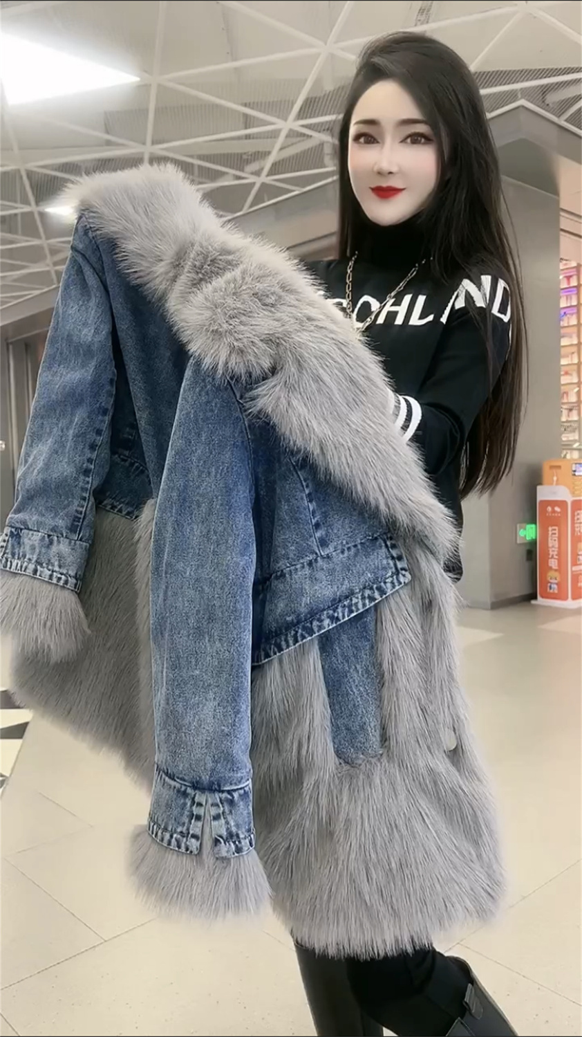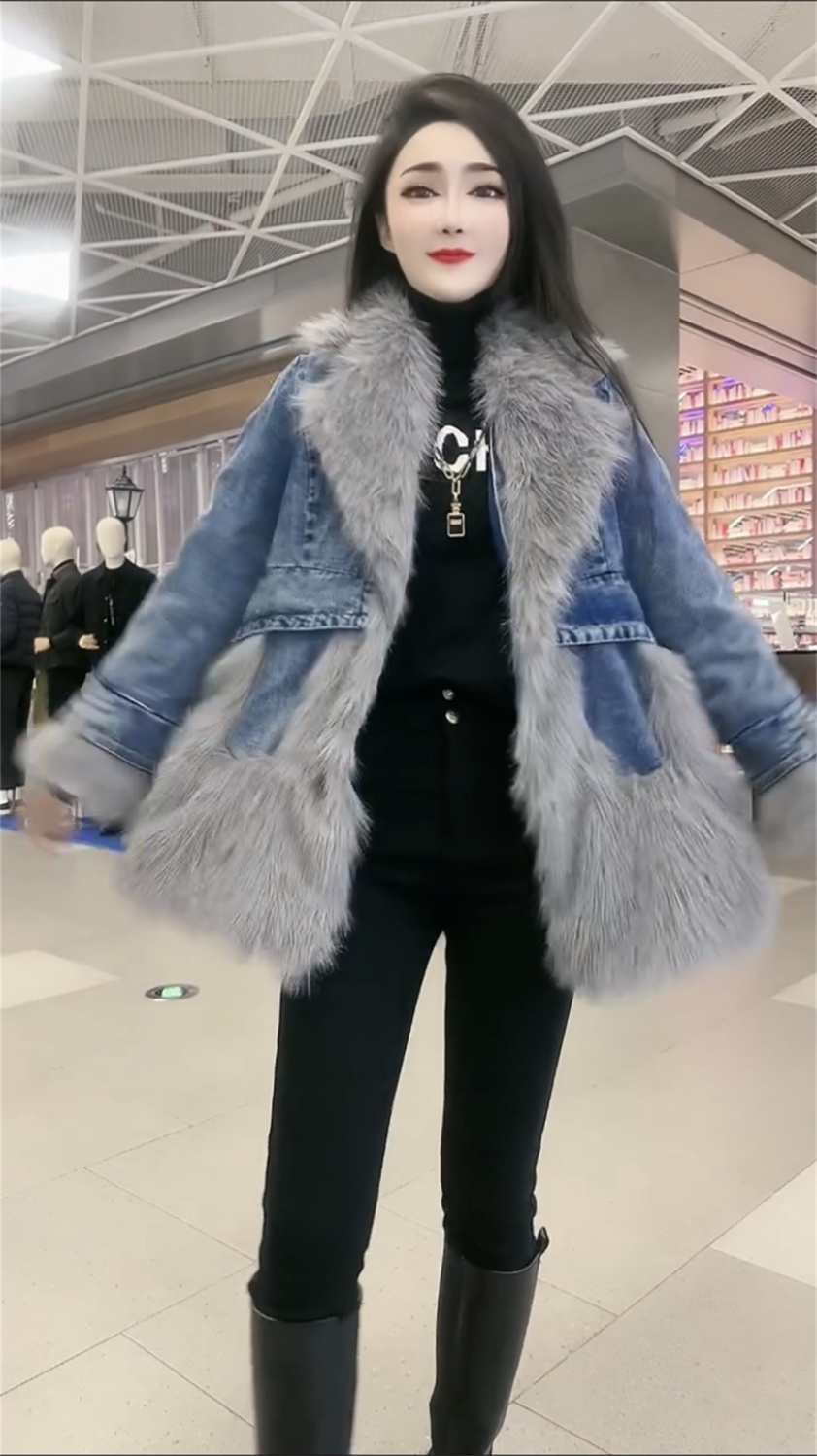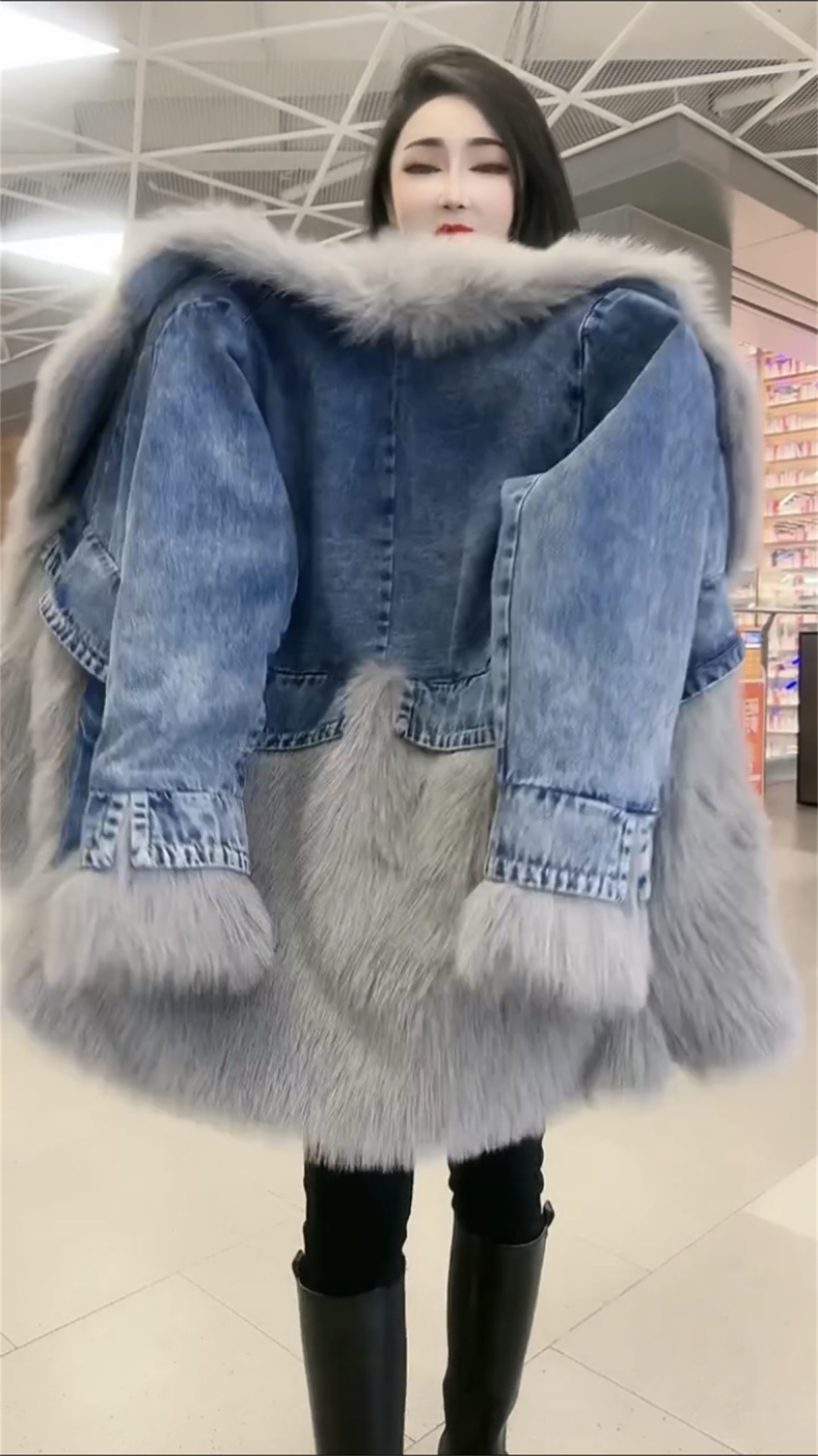 P denim spliced sweater collar coat