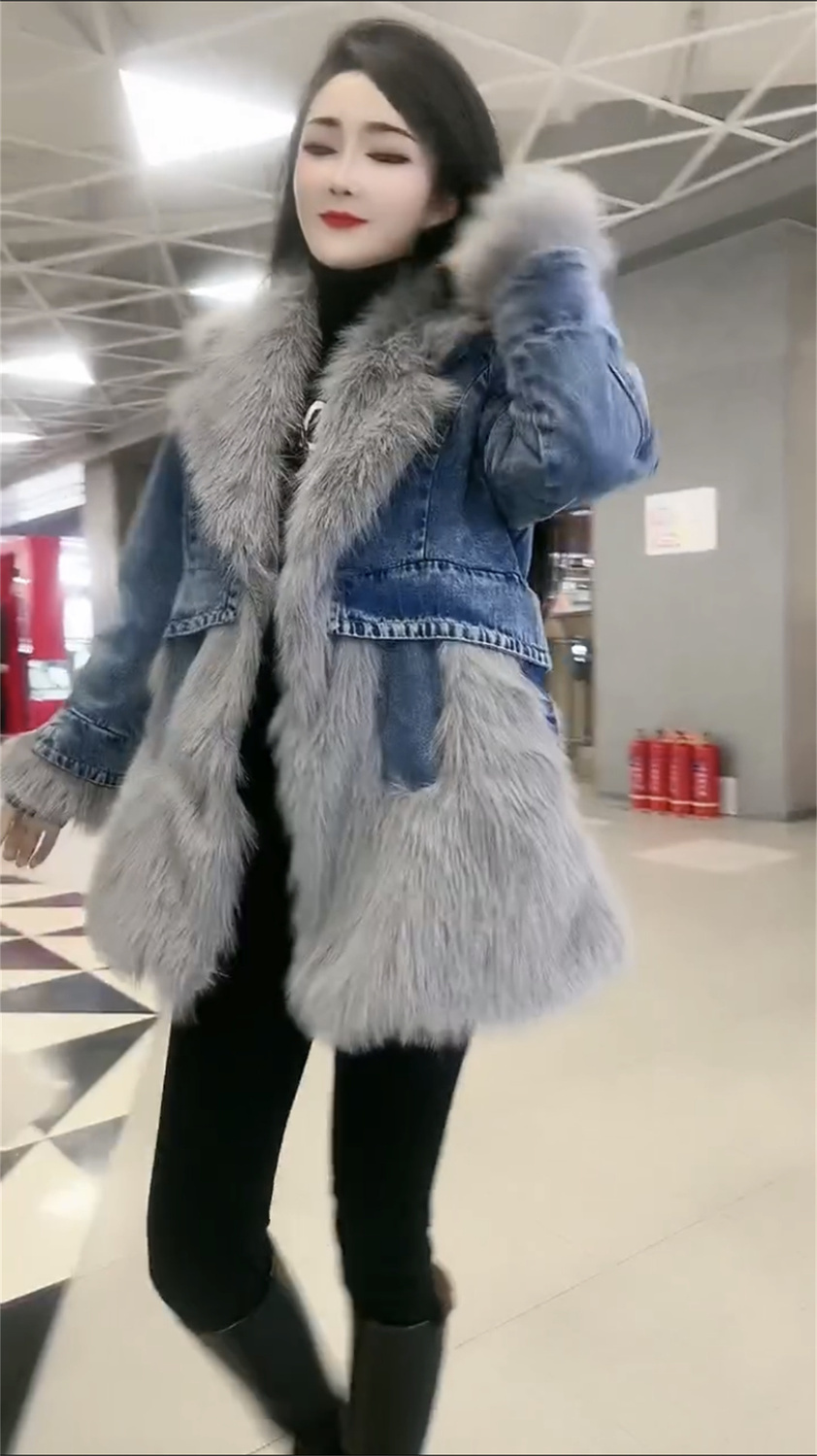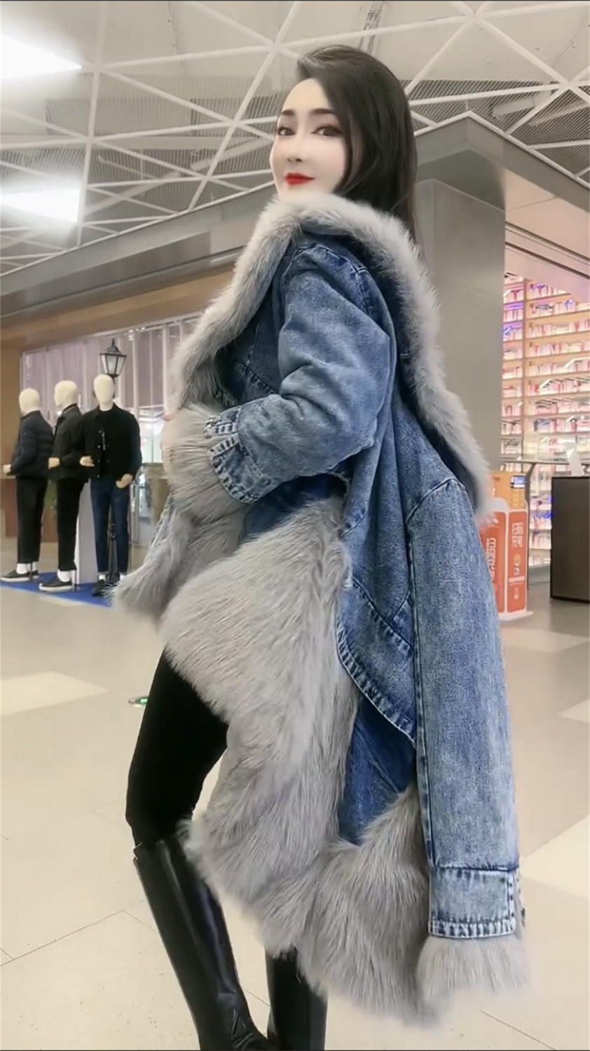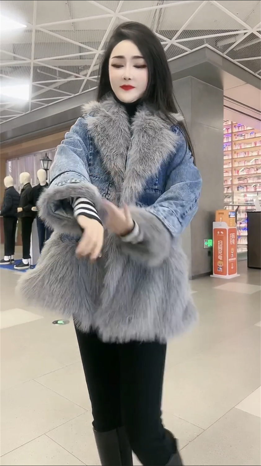 P denim spliced sweater collar coat