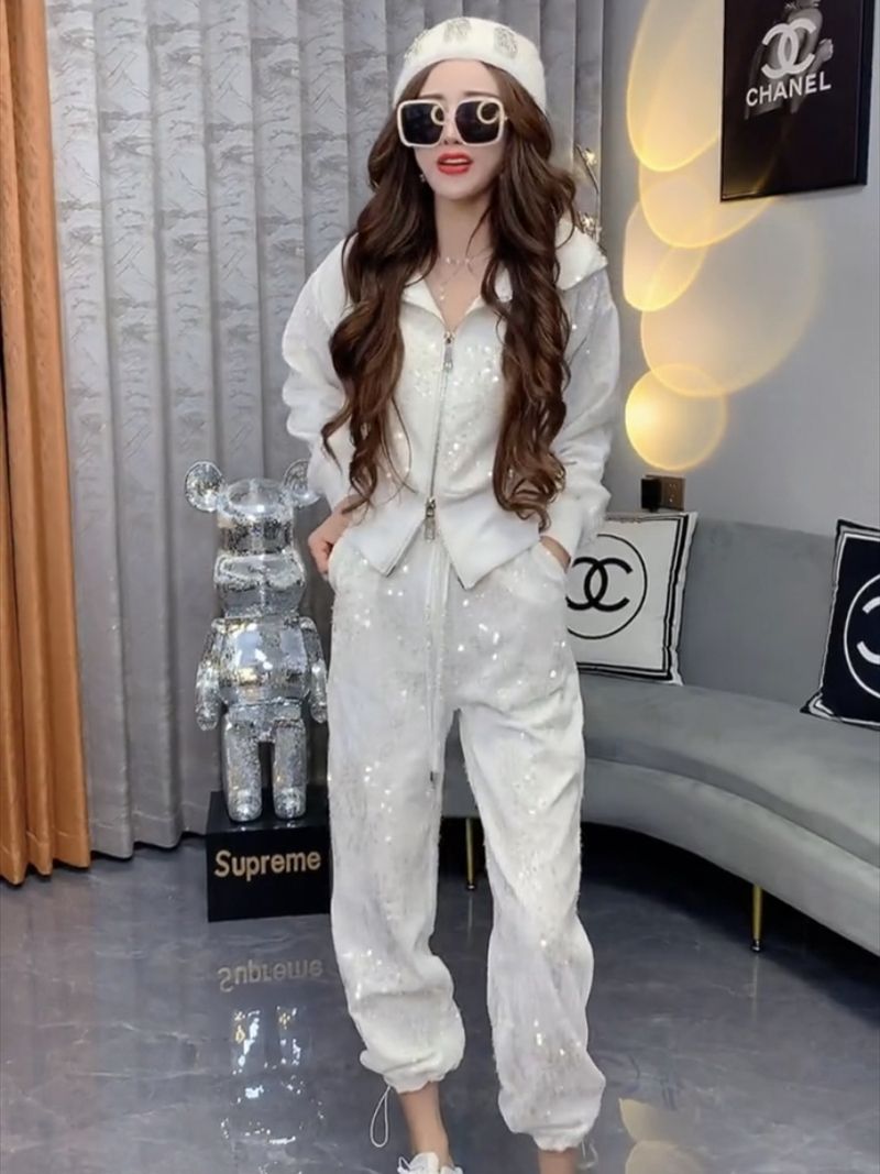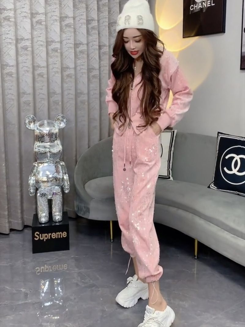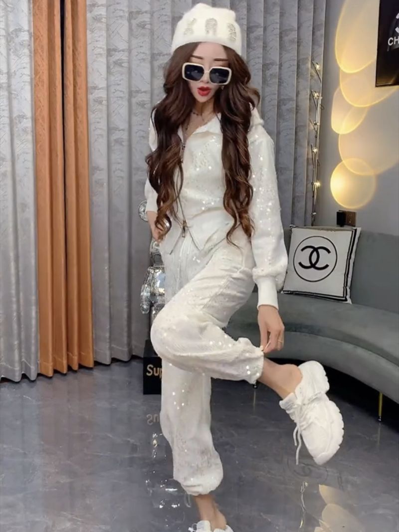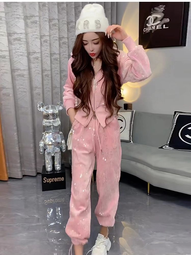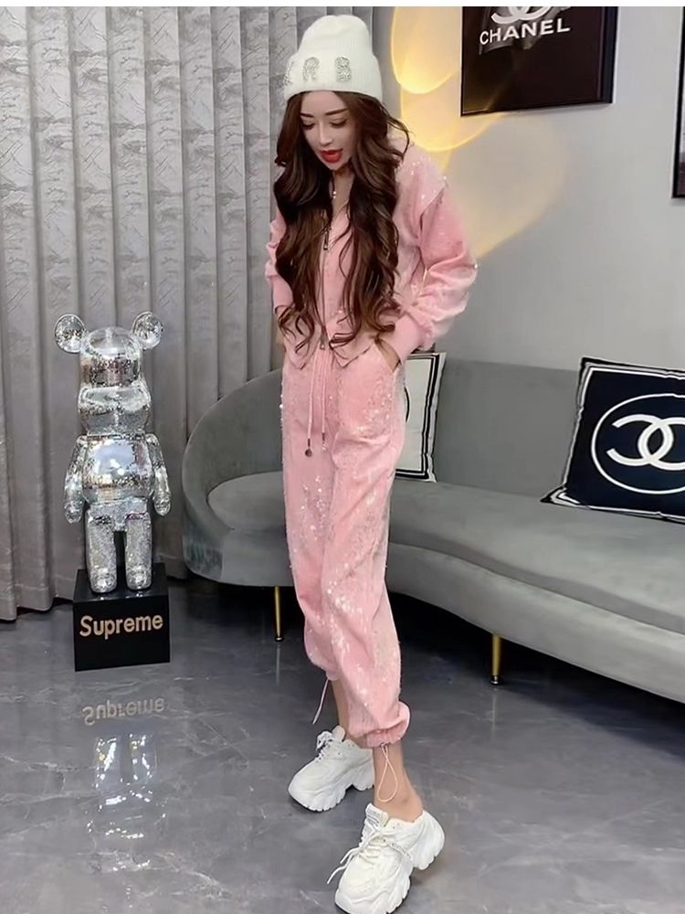 A ny sequined zipper hooded sweater women's foot mouth elastic two-piece set