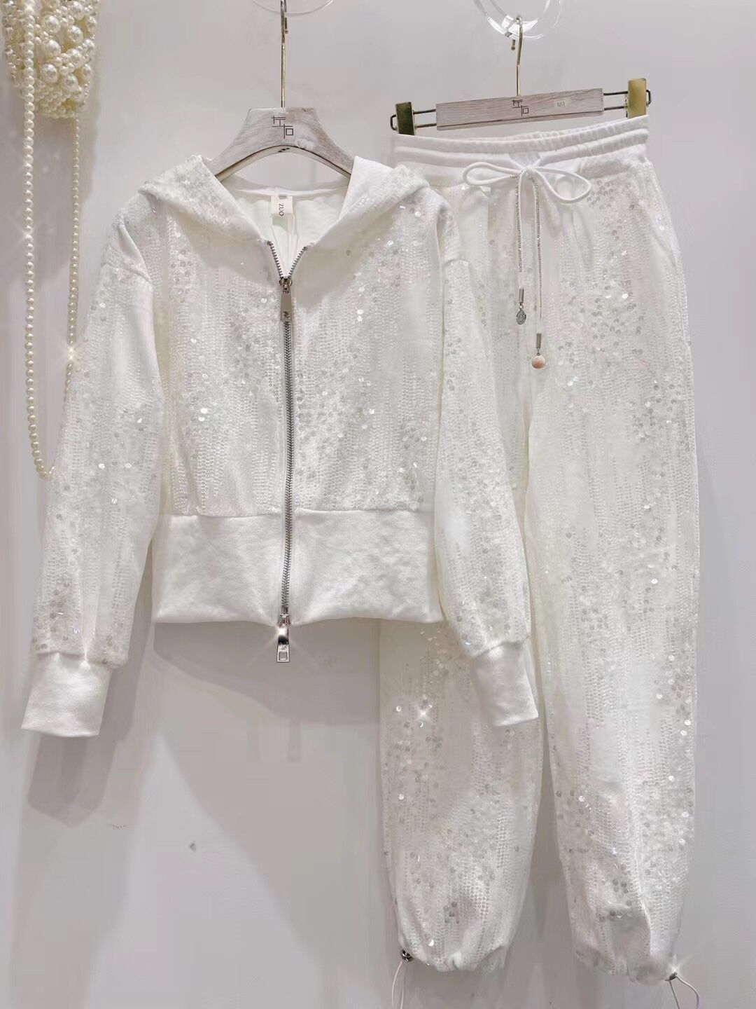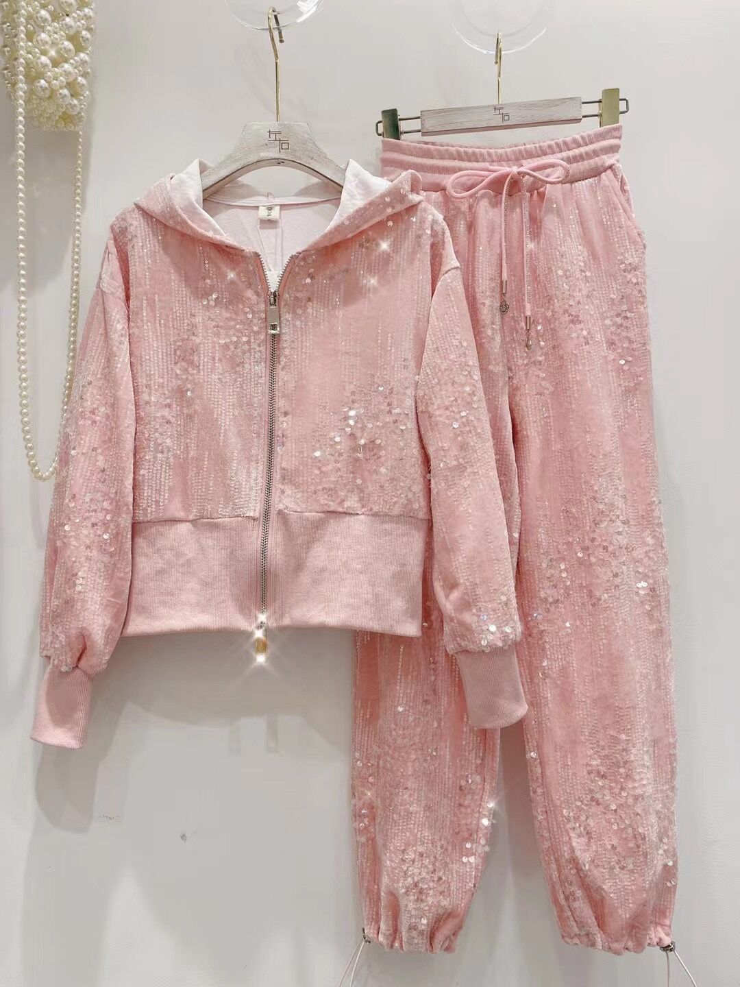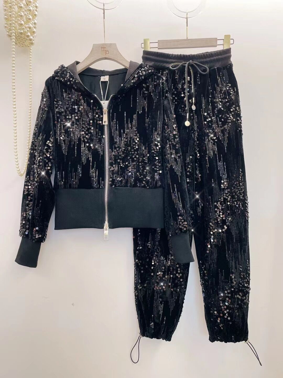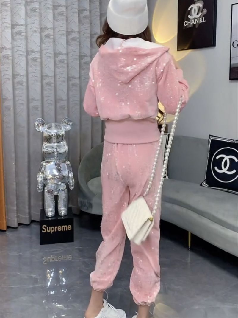 A ny sequined zipper hooded sweater women's foot mouth elastic two-piece set
