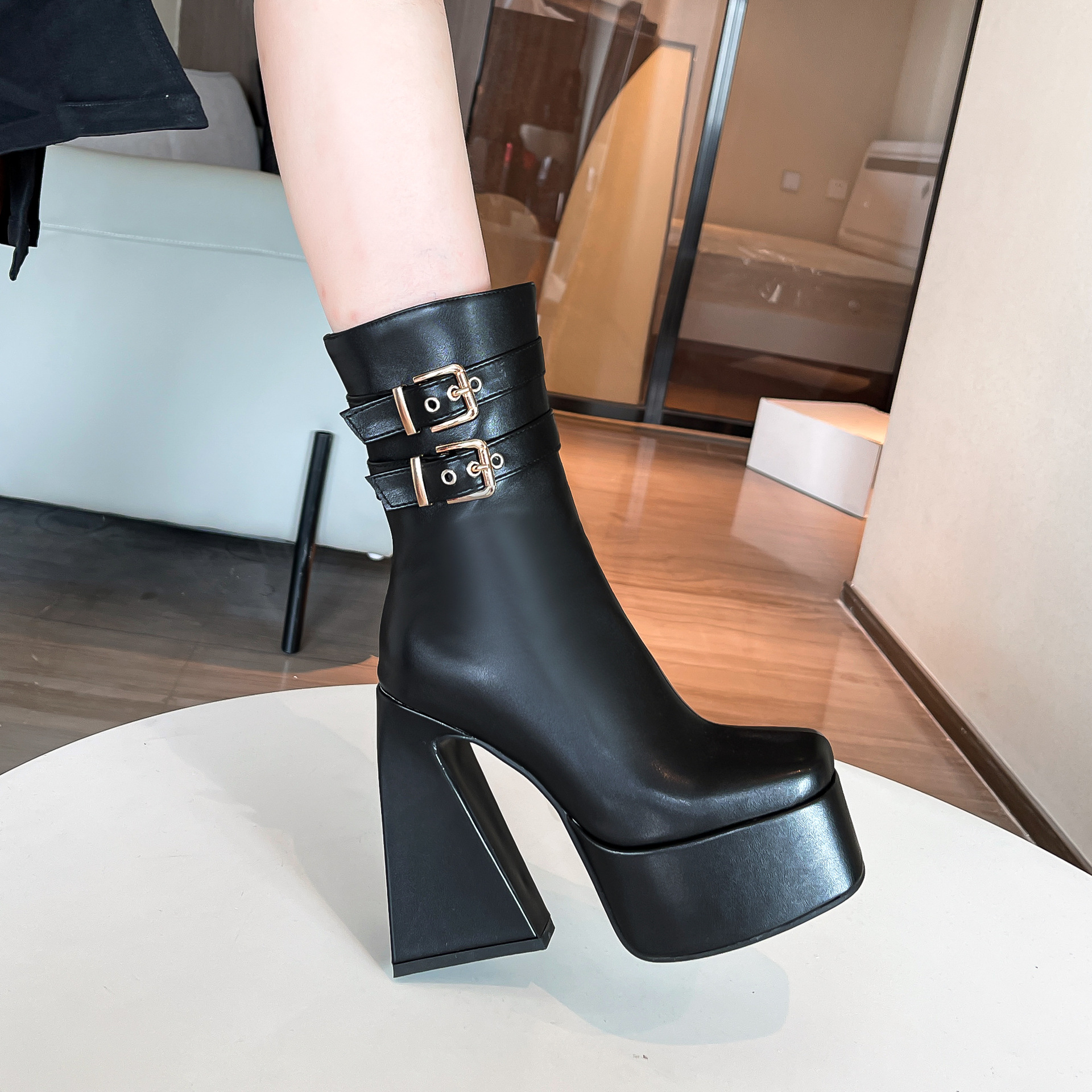 A Hollow Women's Waterproof Platform High Heel Square Head Side Zipper Fashion Boots