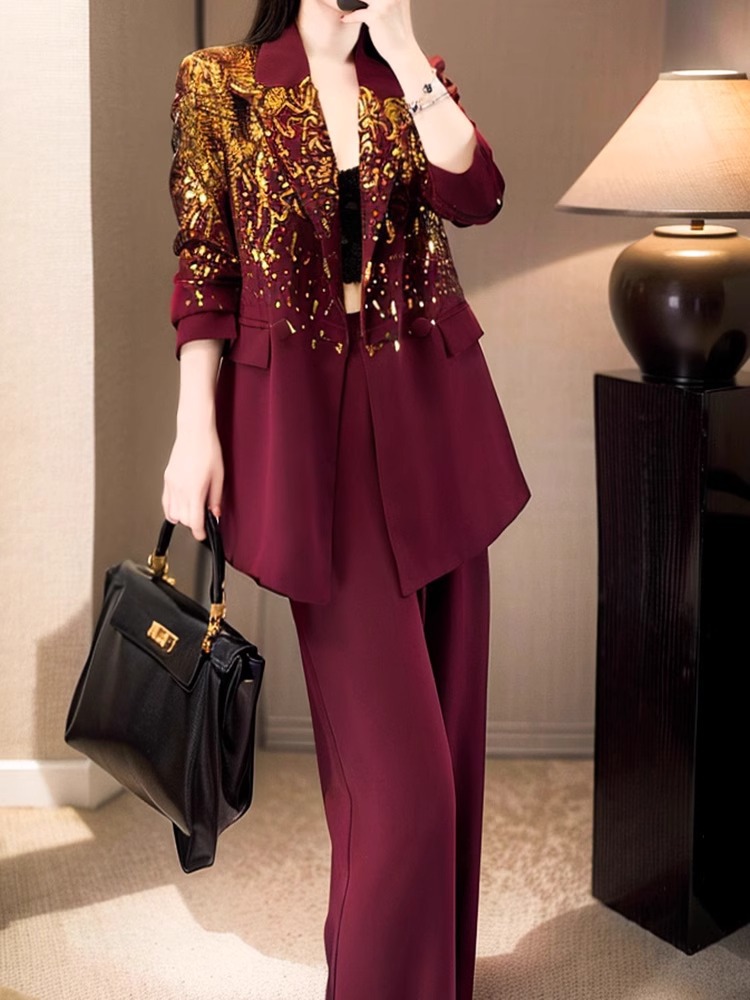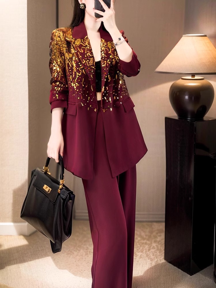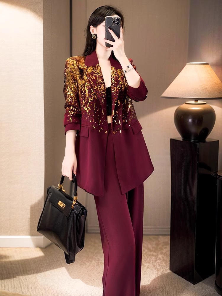 A autumn women's clothing commuting light wear, slightly fat and thin Angola red sequined suit wide-leg pants two-piece suit