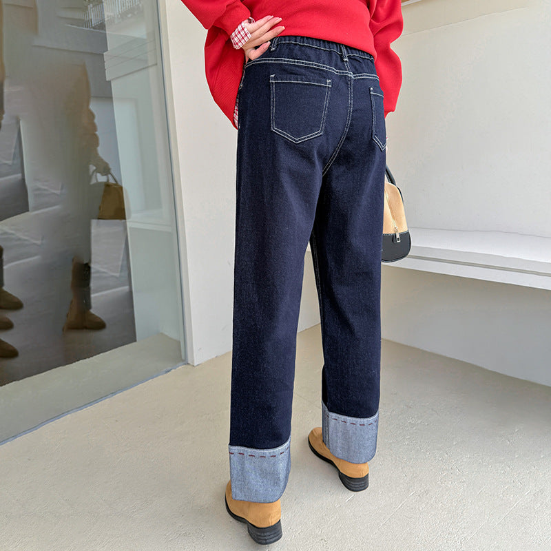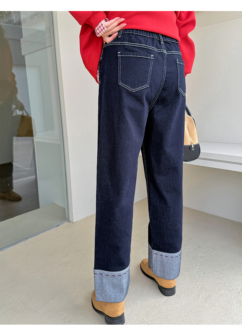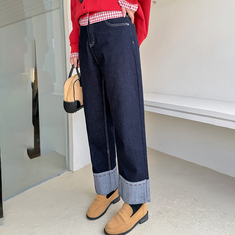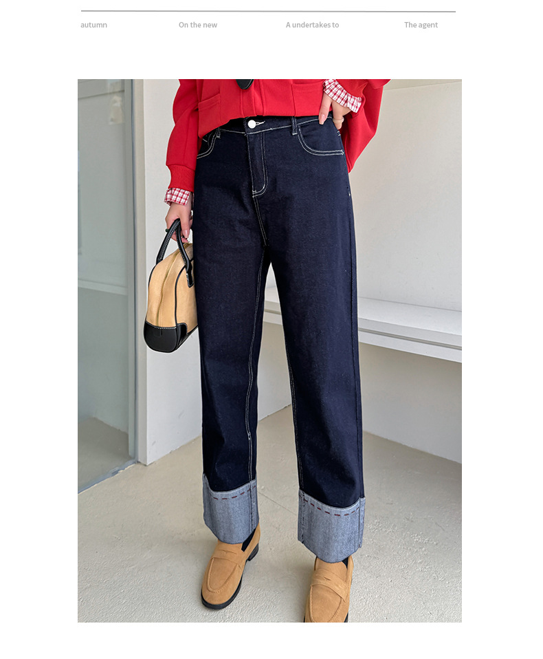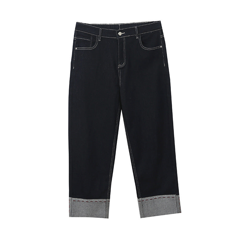 A Women's Curled Straight Pants High Waist Jeans