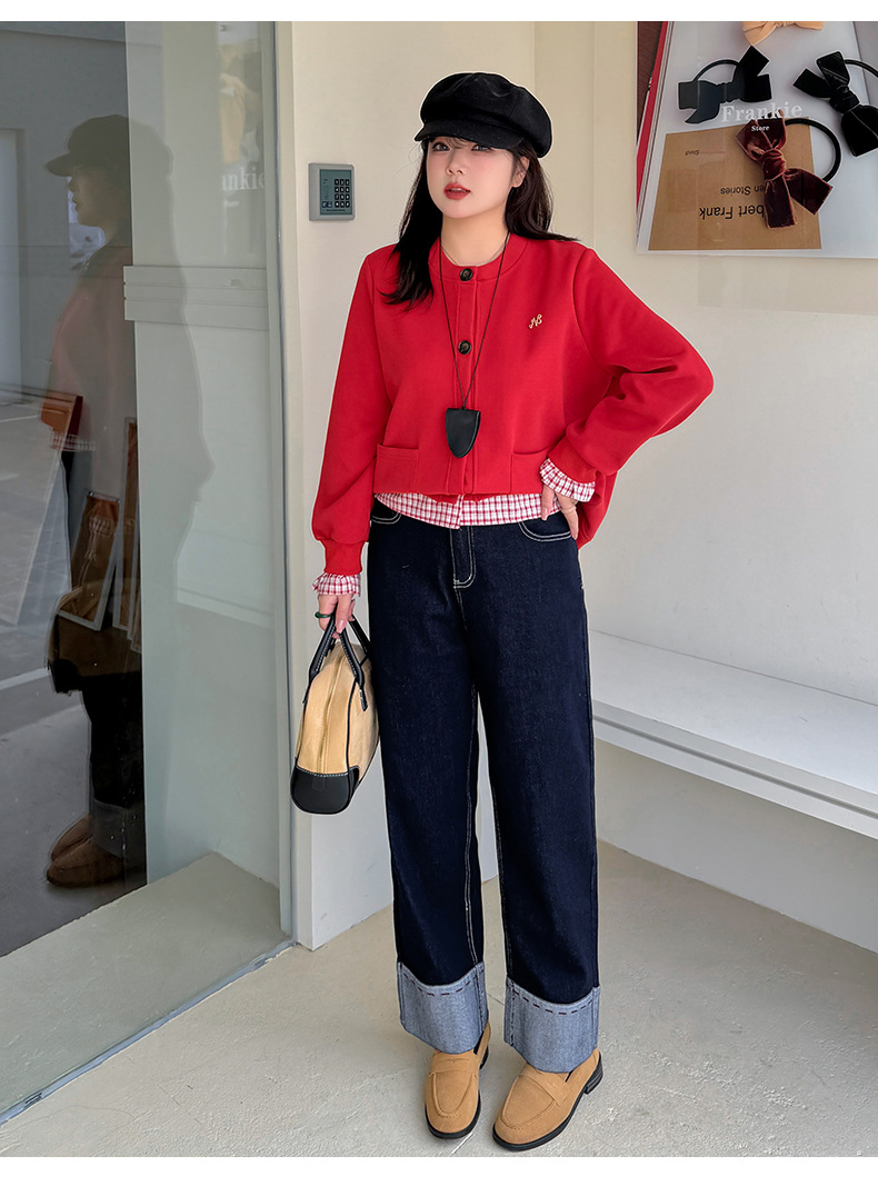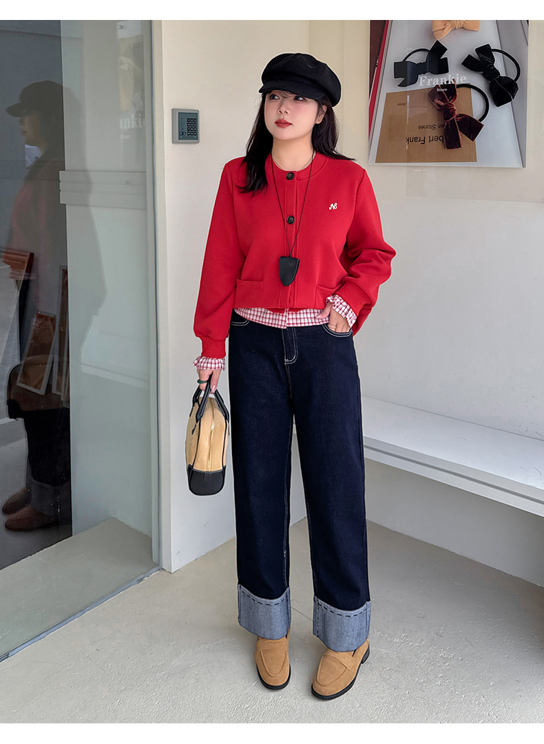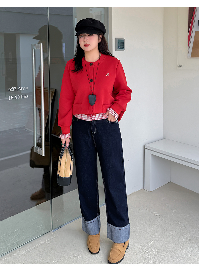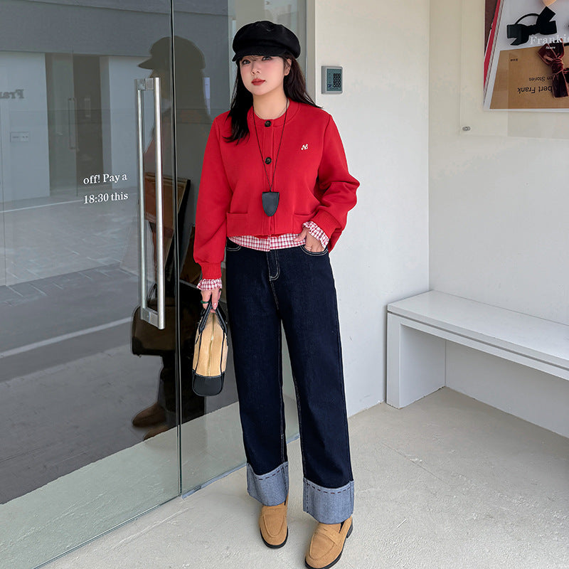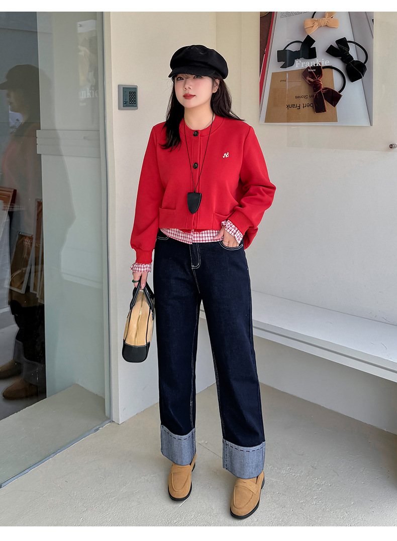 A Women's Curled Straight Pants High Waist Jeans