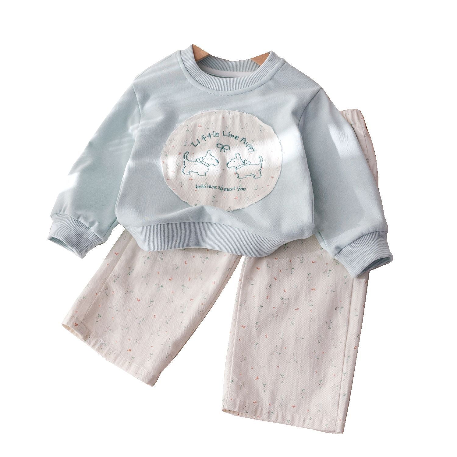 P girls spring and autumn new suit sweet and cute embroidered patch sweater foreign style floral loose straight pants two-piece set
