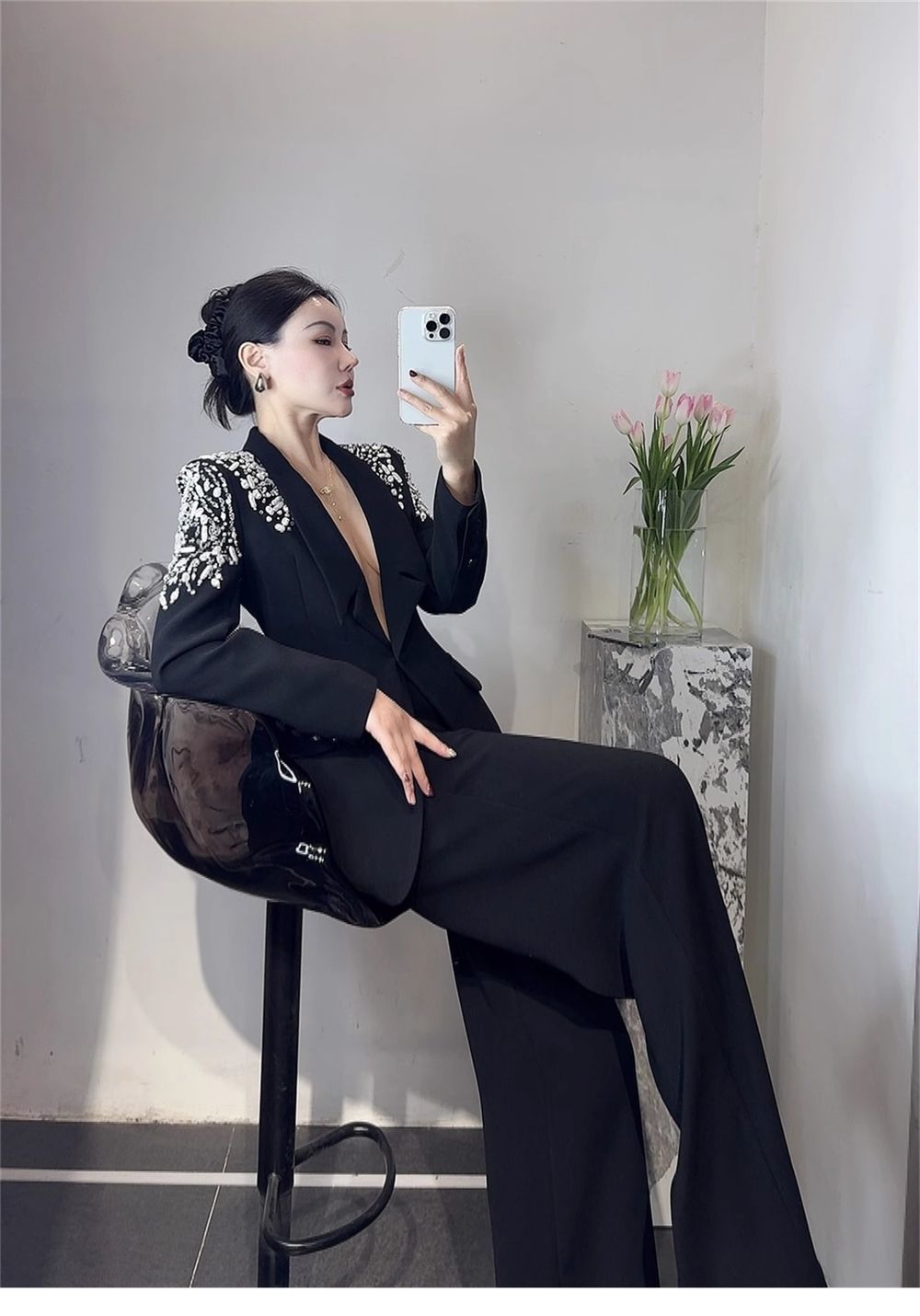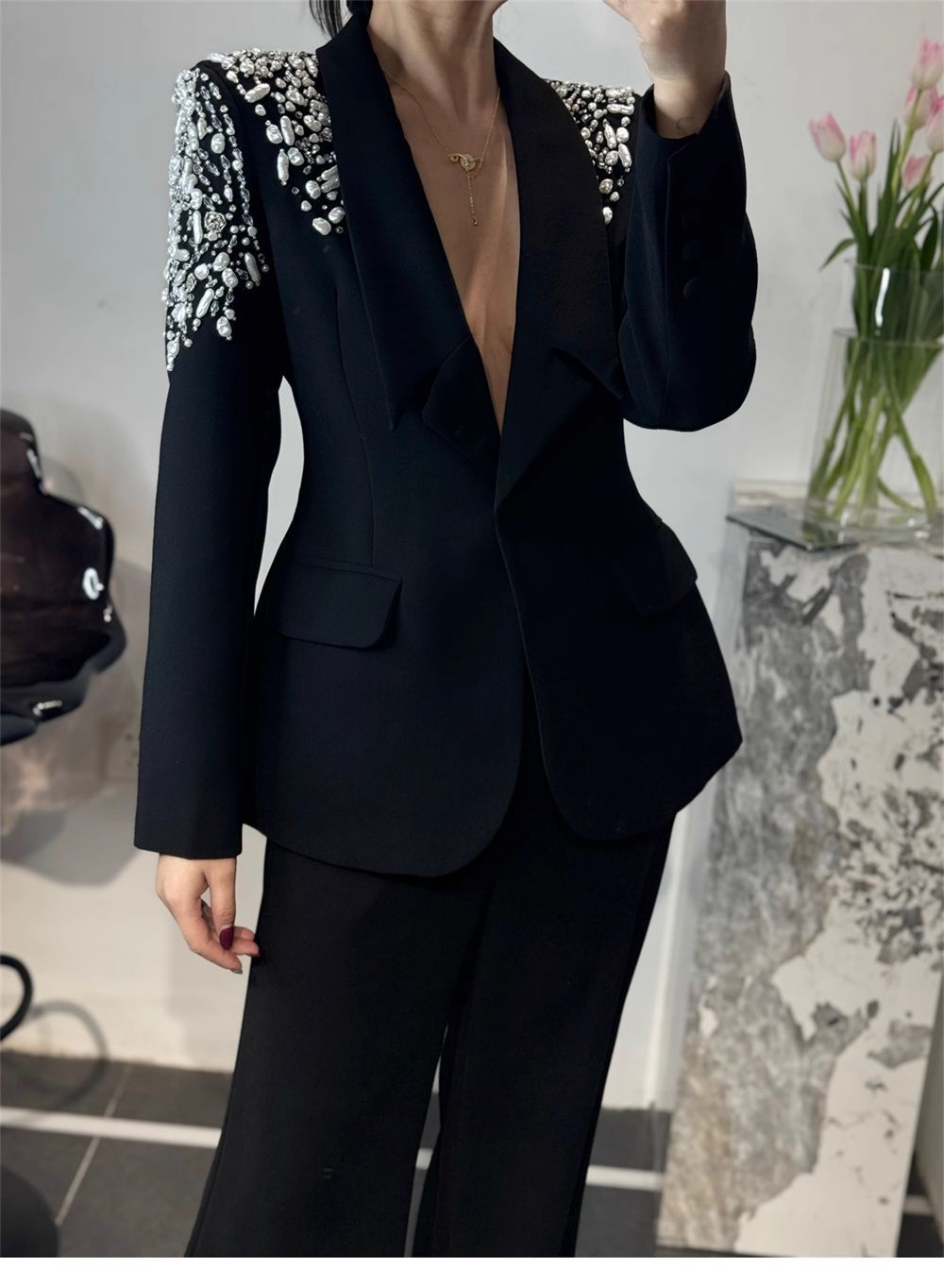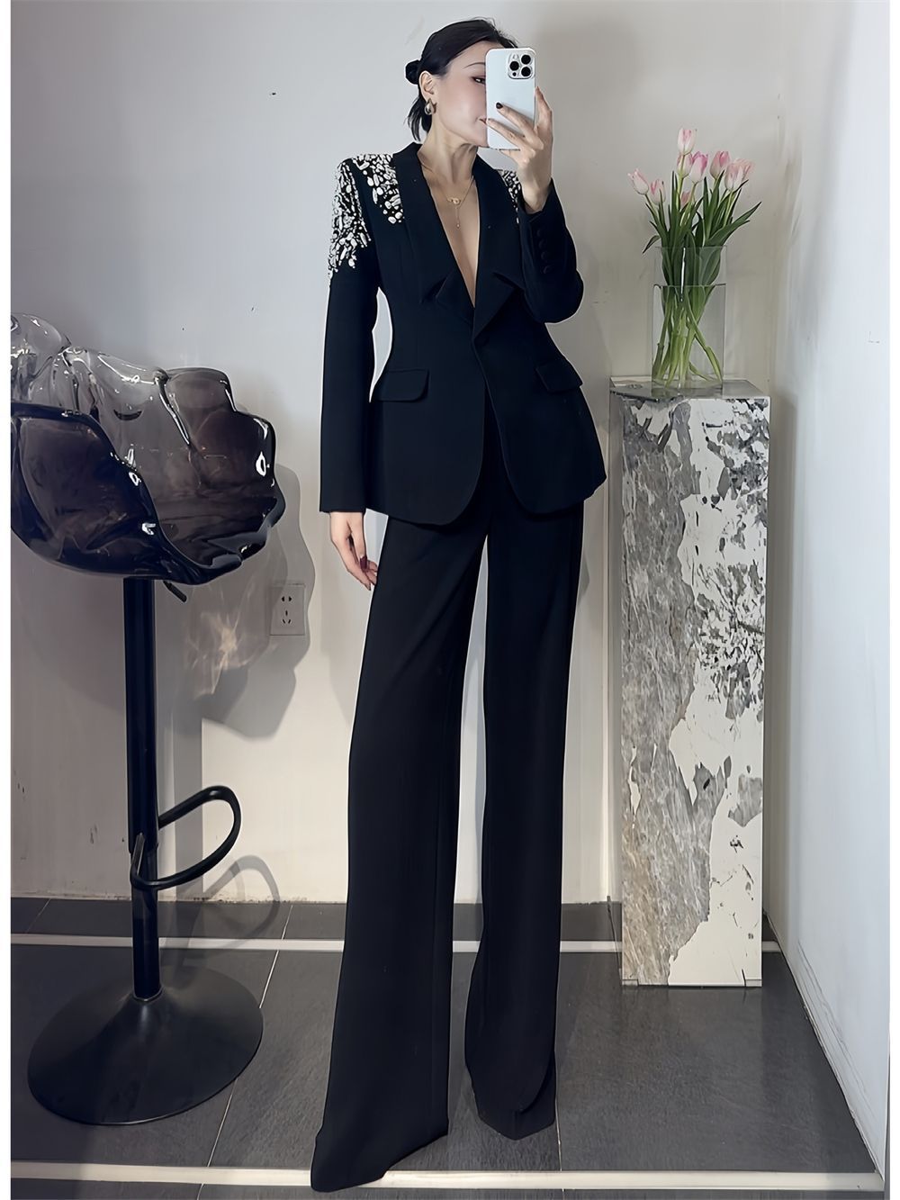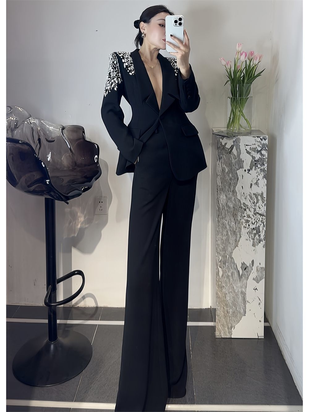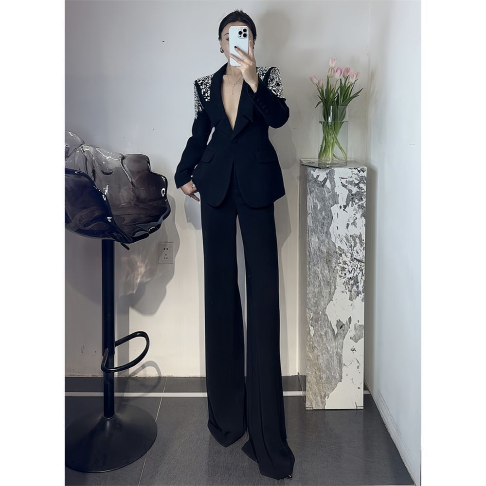 P Korean version of light luxury heavy industry hot diamond suit trousers suit fashion temperament high foreign style two-piece set tide