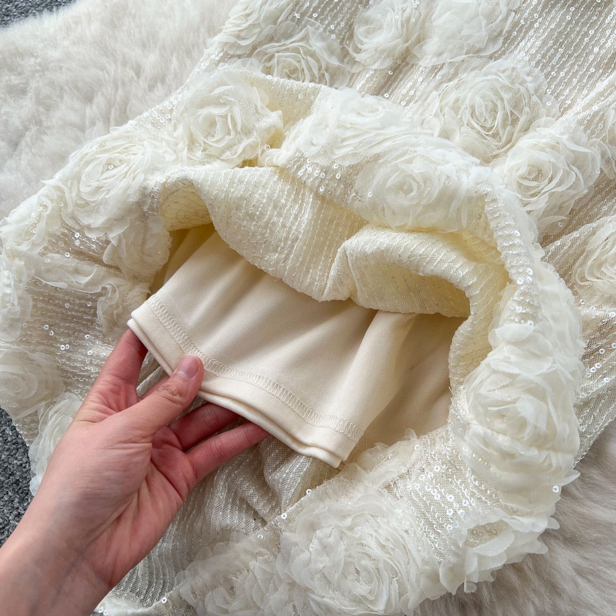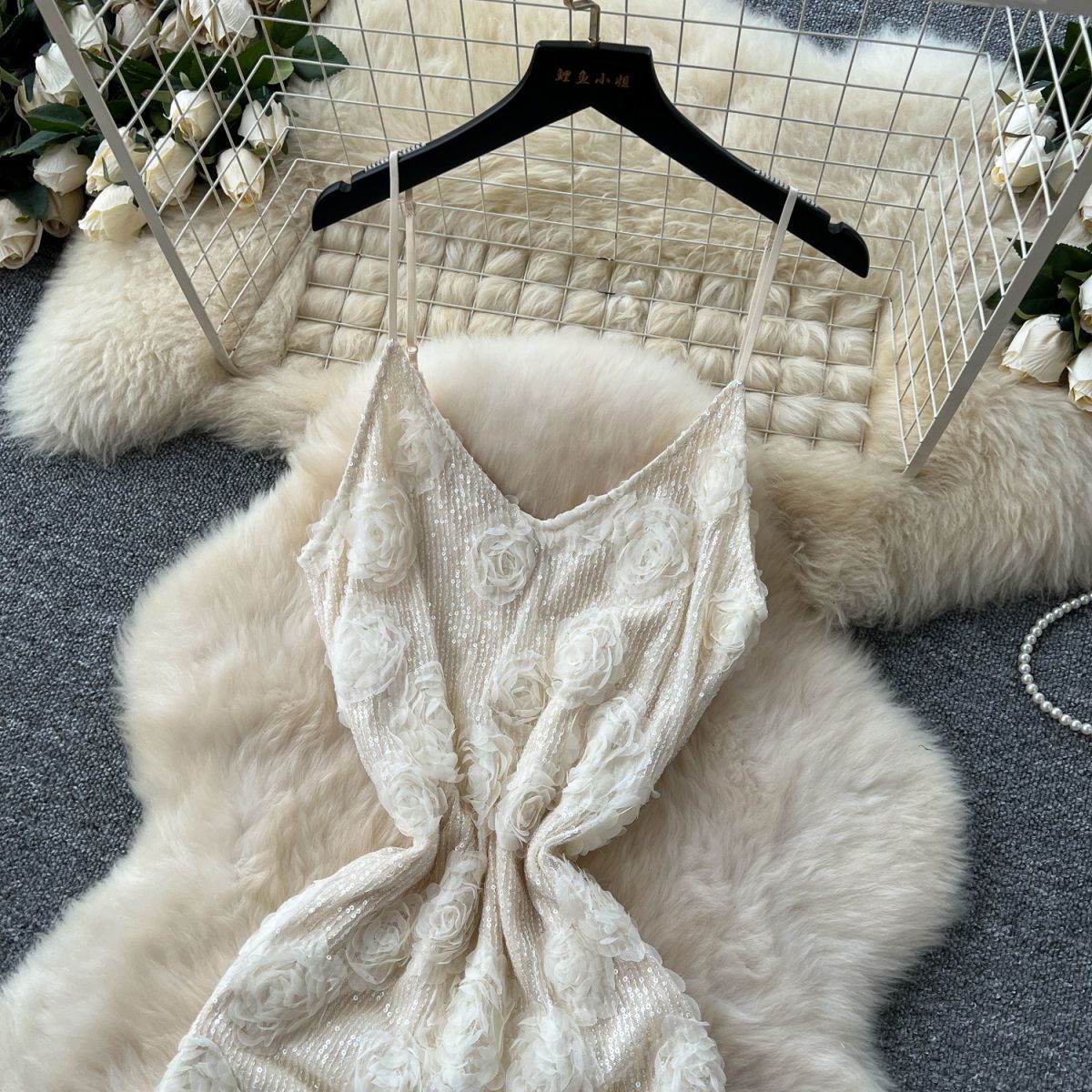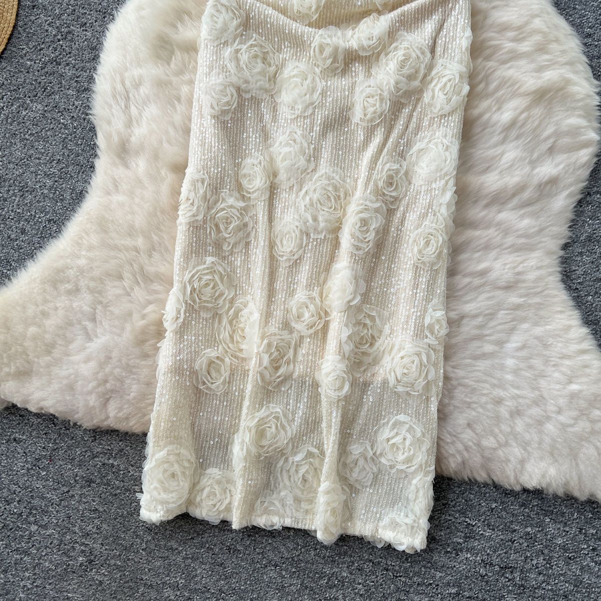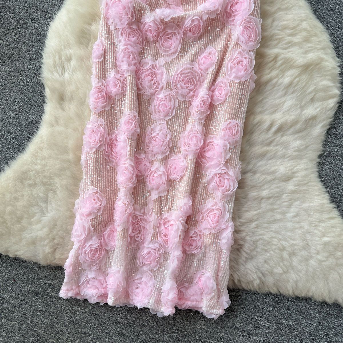 P light luxury celebrity high-end three-dimensional flower sequin dress women's summer French waist slim-fitting hip-wrapped long skirt