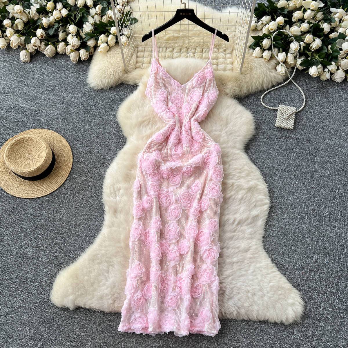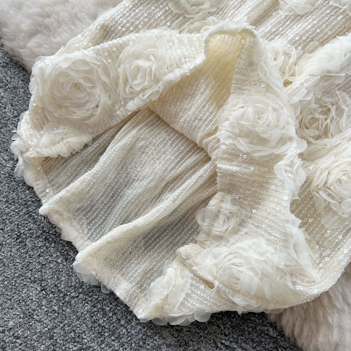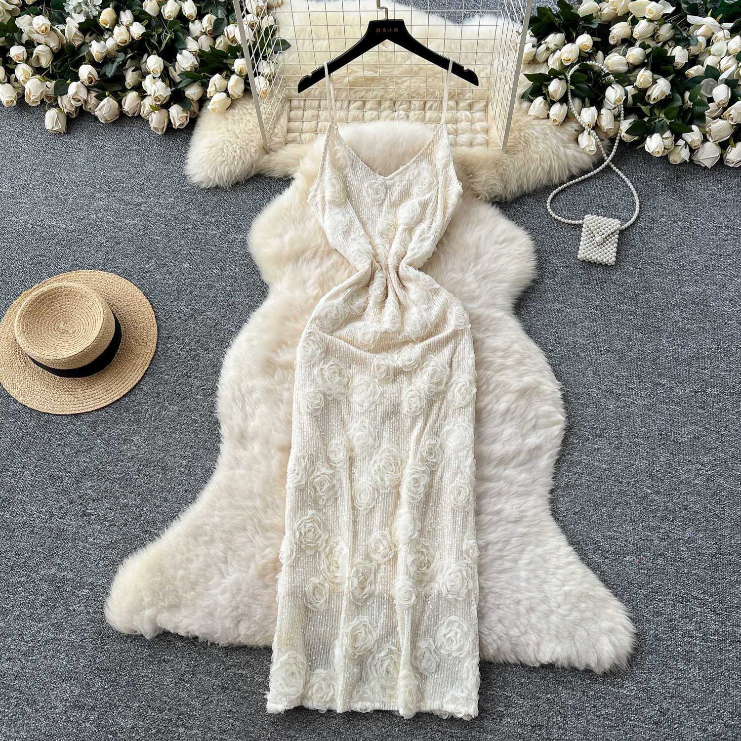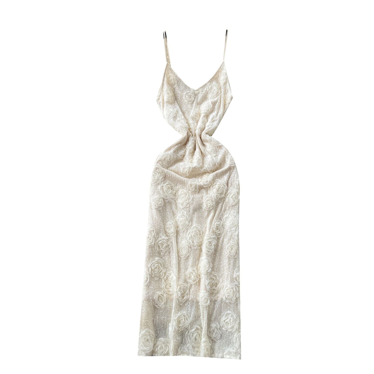 P light luxury celebrity high-end three-dimensional flower sequin dress women's summer French waist slim-fitting hip-wrapped long skirt