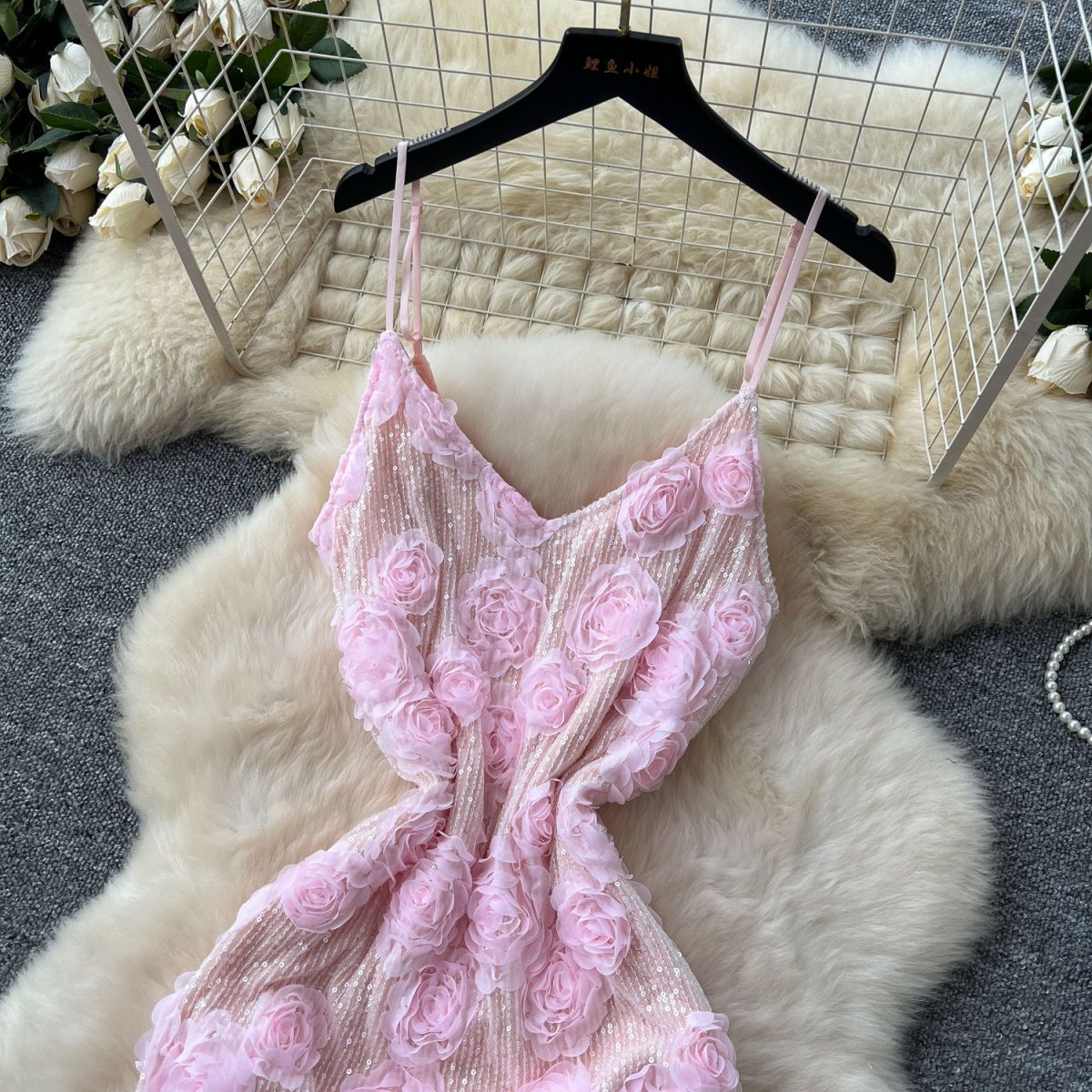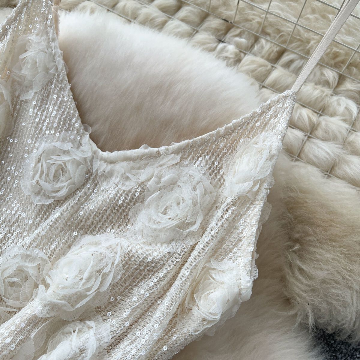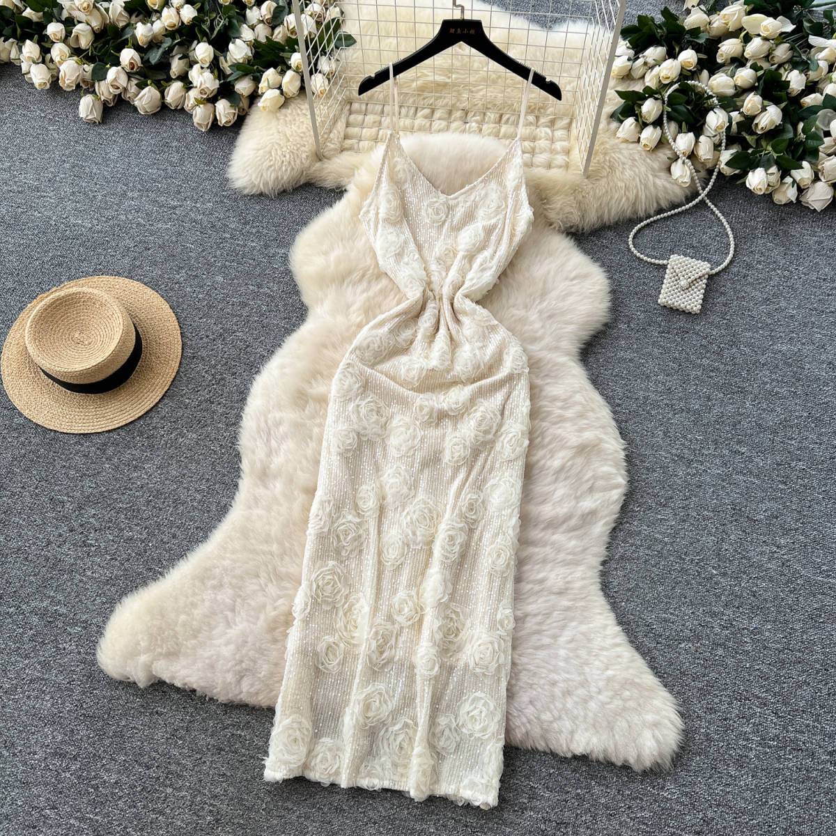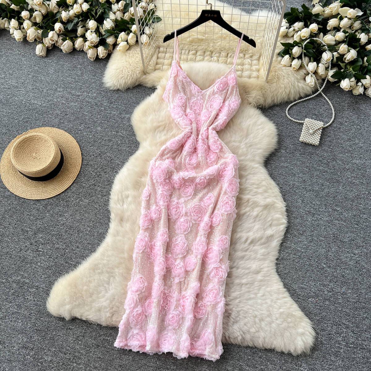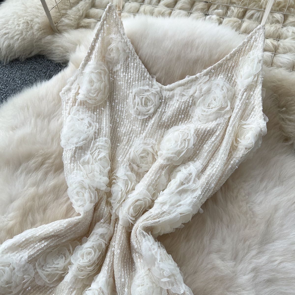 P light luxury celebrity high-end three-dimensional flower sequin dress women's summer French waist slim-fitting hip-wrapped long skirt