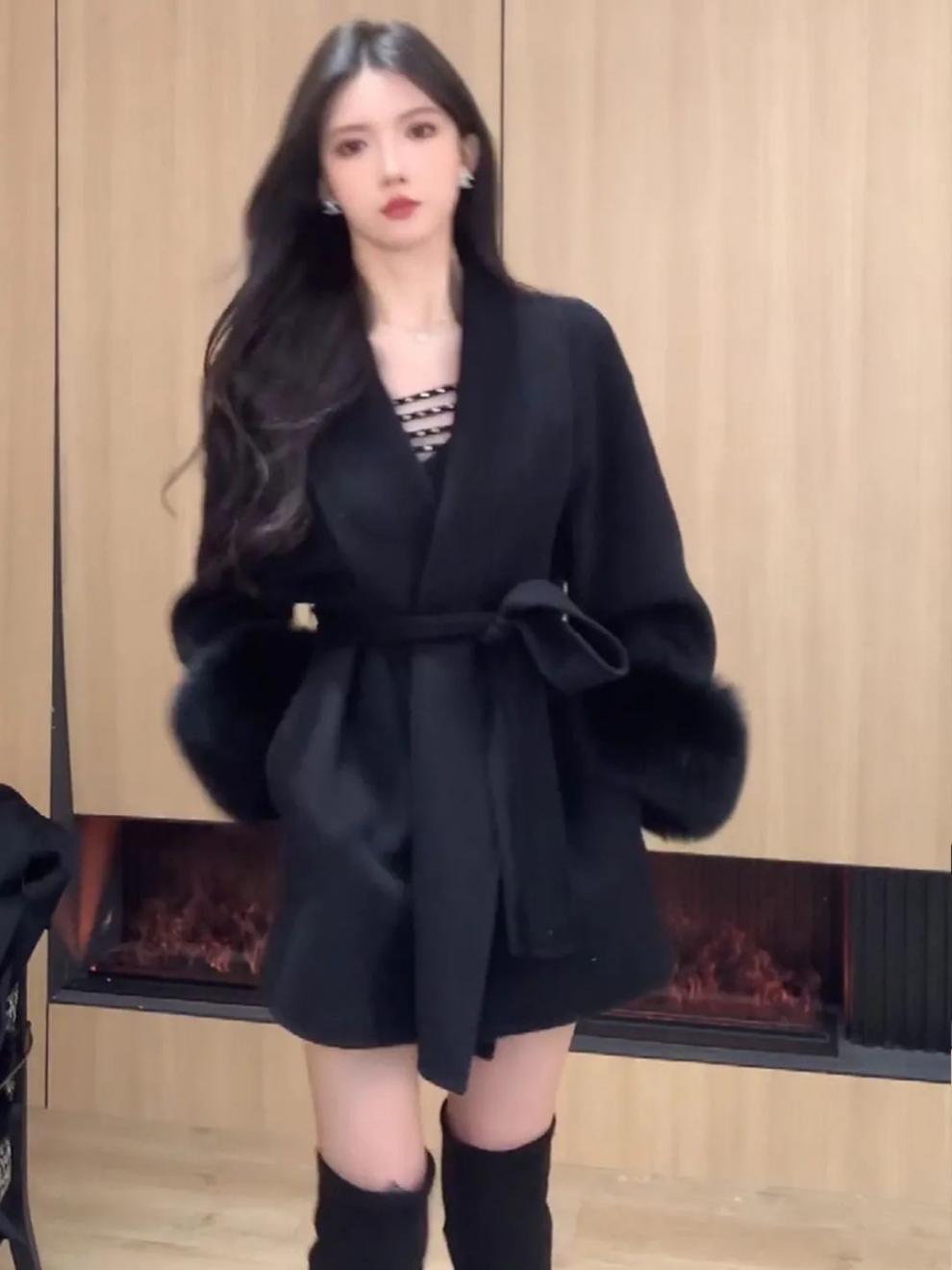 A strap, hairy sleeves, thin Hepburn woolen coat, women's autumn and winter woolen temperament, new product sense, thin coat, slim fit