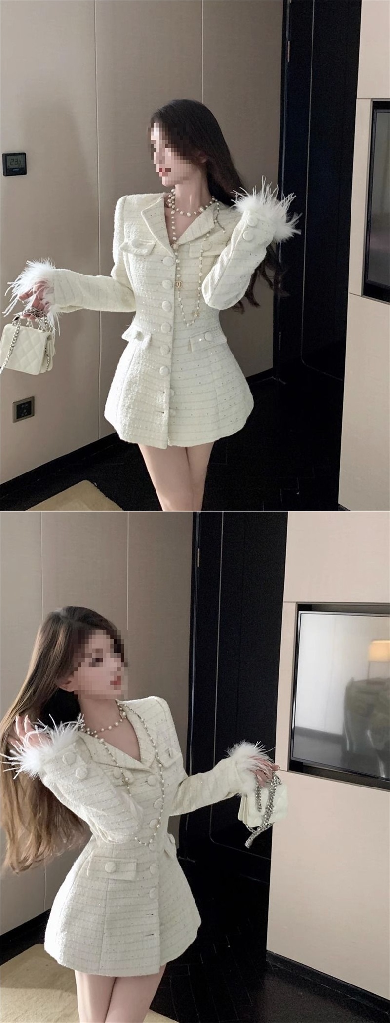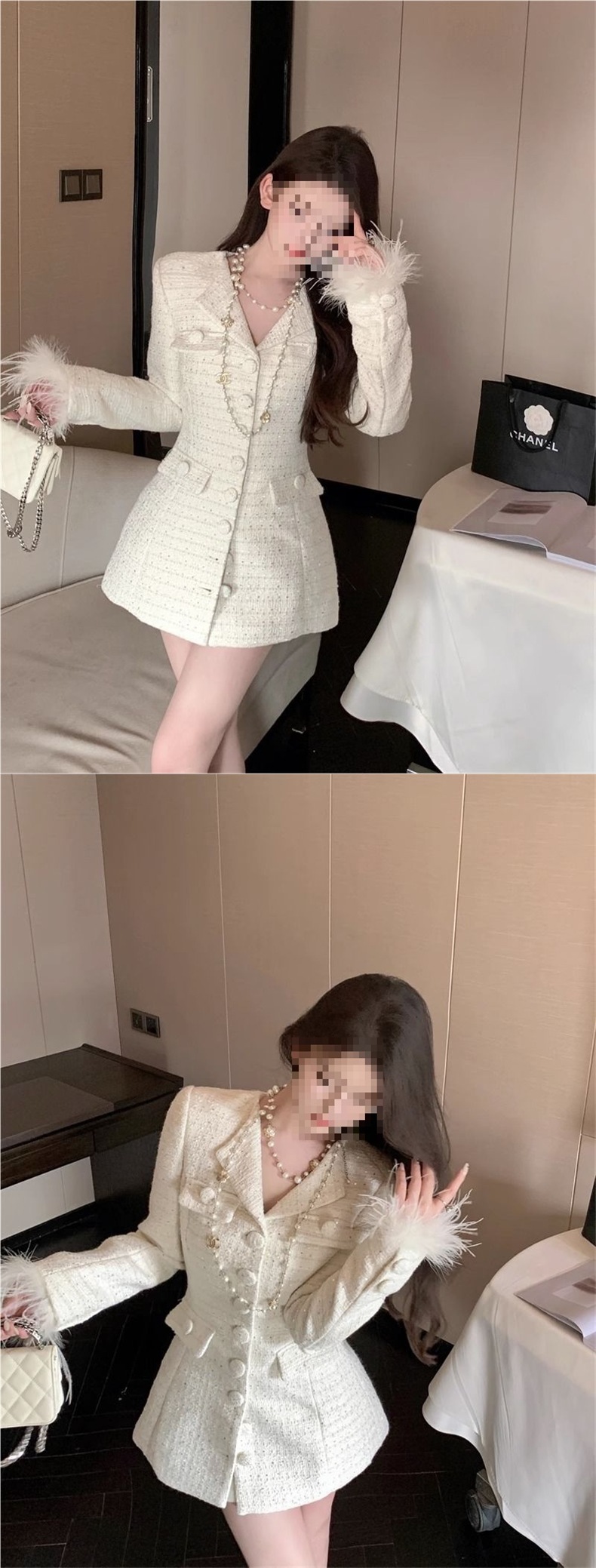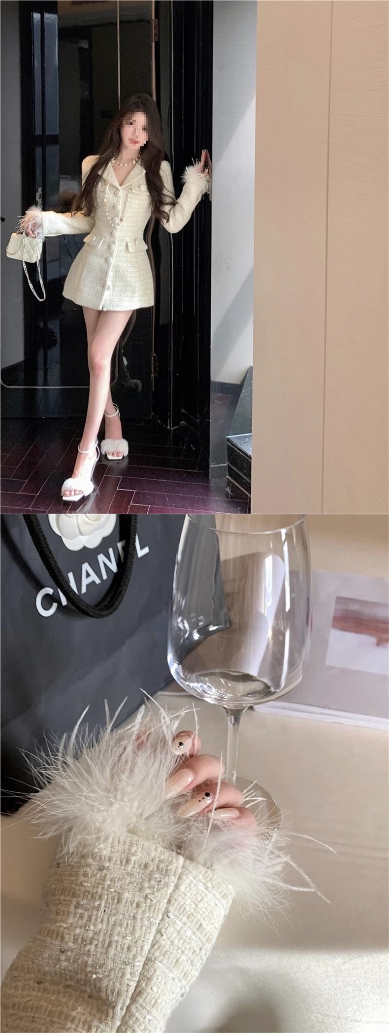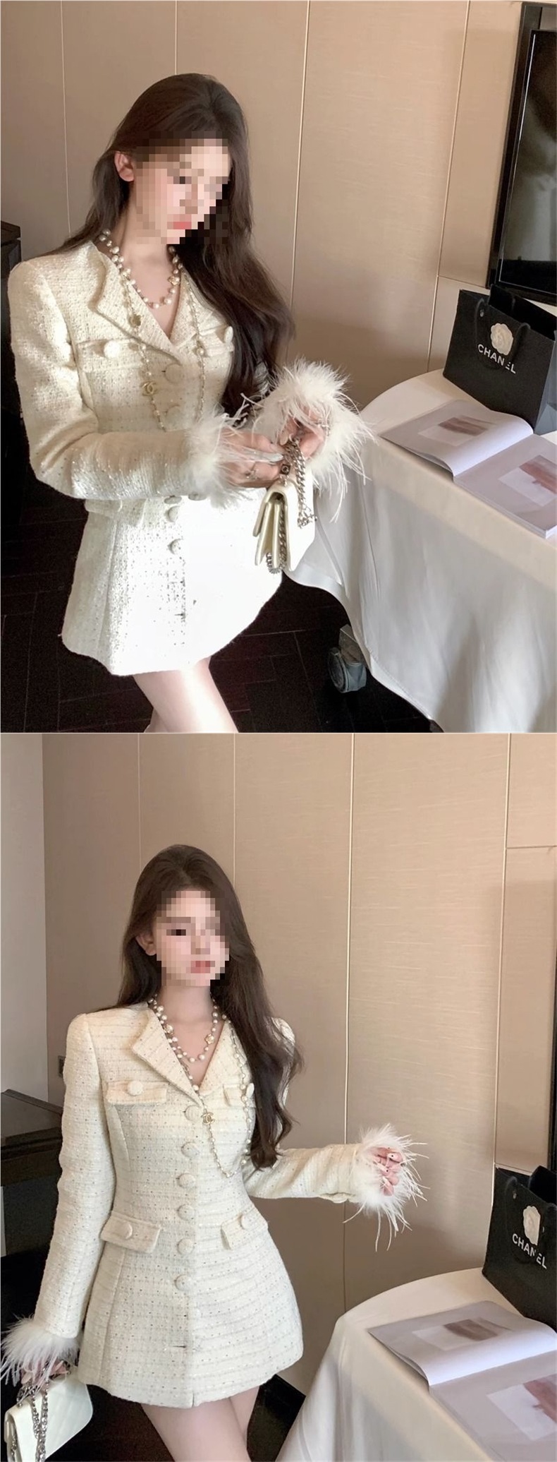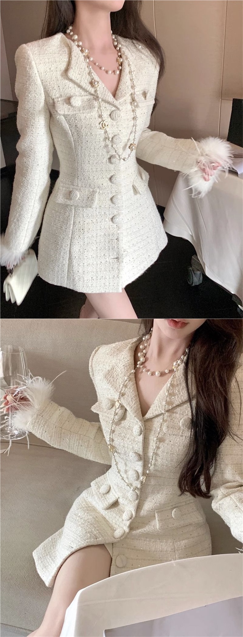 A Xiaoxiangfeng woven blazer women's autumn feeling new slim-fitting medium and long fluffy splicing top
